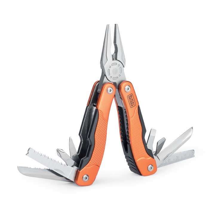 Večnamensko orodje Black+Decker BDHT0–28110 vsebuje univerzalne klešče, škarje za rezanje žice, žaga, majhen nož, velik nož, odpirač za steklenice, klešče, izvijač in ravnilo. Celoten opis