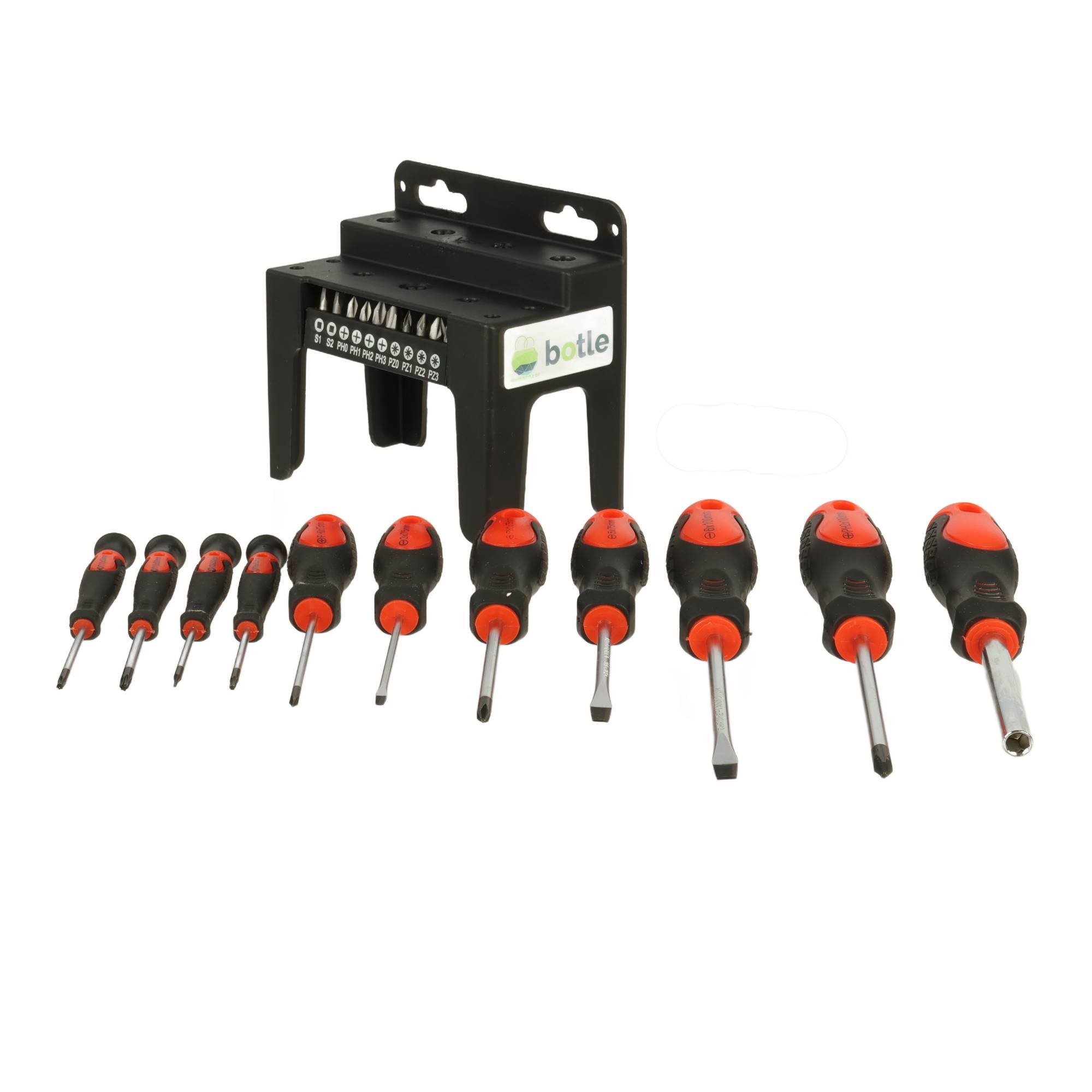 Izvijači, izvijači, set. 21 elementov – brez njih ne boste mogli odviti ali priviti nobenega sornika ali vijaka. Ročaji so iz nedrsečega materiala. Njihova ergonomska oblika zagotavlja udobje pri uporabi. Konice izvijačev so magnetizirane in ojačane, zaradi česar so nenadomestljivi pri delu z elektroniko, gospodinjskimi aparati ali računalniki.