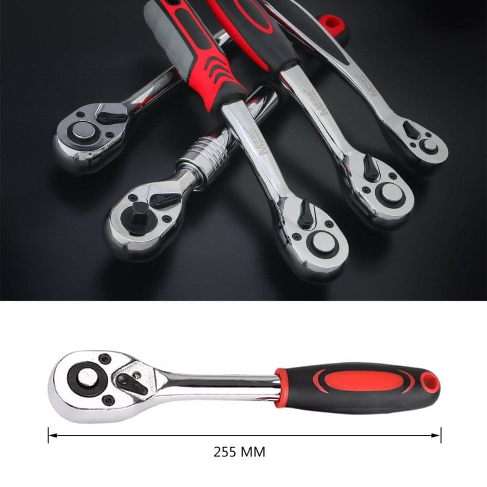 Ergonomska raglja 1/4" ima udoben oprijem in omogoča nemoteno delo tudi na težje dostopnih mestih. Natančno označene dimenzije na posameznih delih vam omogočajo hitro izbiro pravega orodja. Poleg tega paket vključuje tudi podaljške, kardanski zglob, fleksibilen nastavek in različne vrste nastavkov, kar zagotavlja maksimalno fleksibilnost pri delu.