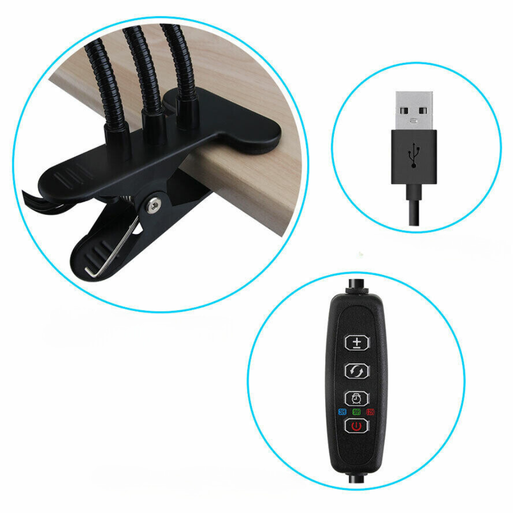 je opremljena z vtičem za vtičnico, zaradi česar je njena uporaba veliko lažja. Svetilko lahko uporabljate prek USB priključka ali tradicionalno jo priključite v vtičnico, kar vam omogoča hitro in enostavno namestitev svetilke kamor koli v vašem domu, rastlinjaku ali celo na vrtu. ☘️STABILNI ROČI, KI DRŽIJO SVETILKO V POLJUBNEM POLOŽAJU