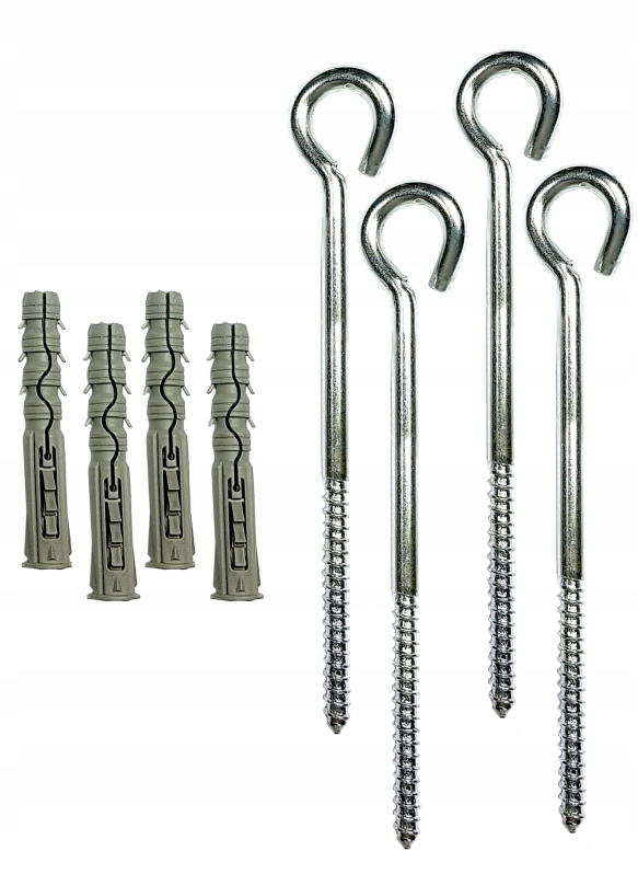 4. Štirje jekleni vijaki s kavljem za uporabo s klini ali za pritrditev v les.