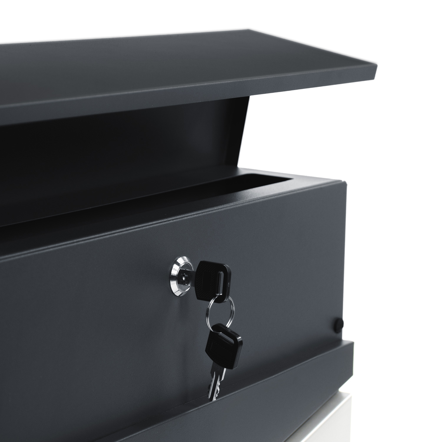Zahvaljujoč trdnemu zgornjemu pokrovu ključavnica poštnega nabiralnika ostane suha, tudi med najmočnejšimi nalivi . Vaša pisma bodo varna in suha, ne glede na vreme!