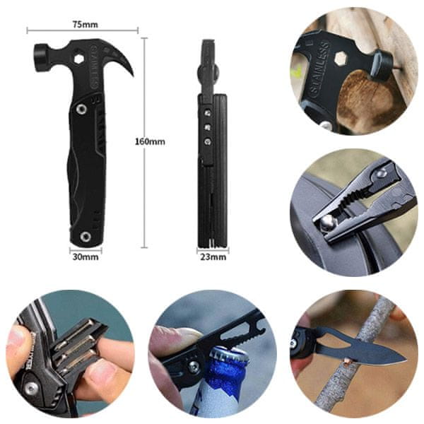 Klešče imajo 7 funkcij, ki vam omogočajo skoraj vse. Vključujejo mini kladivo, šestkotni ključ, klešče, odpirač za steklenice in pločevinke, nož, 3 izvijače…