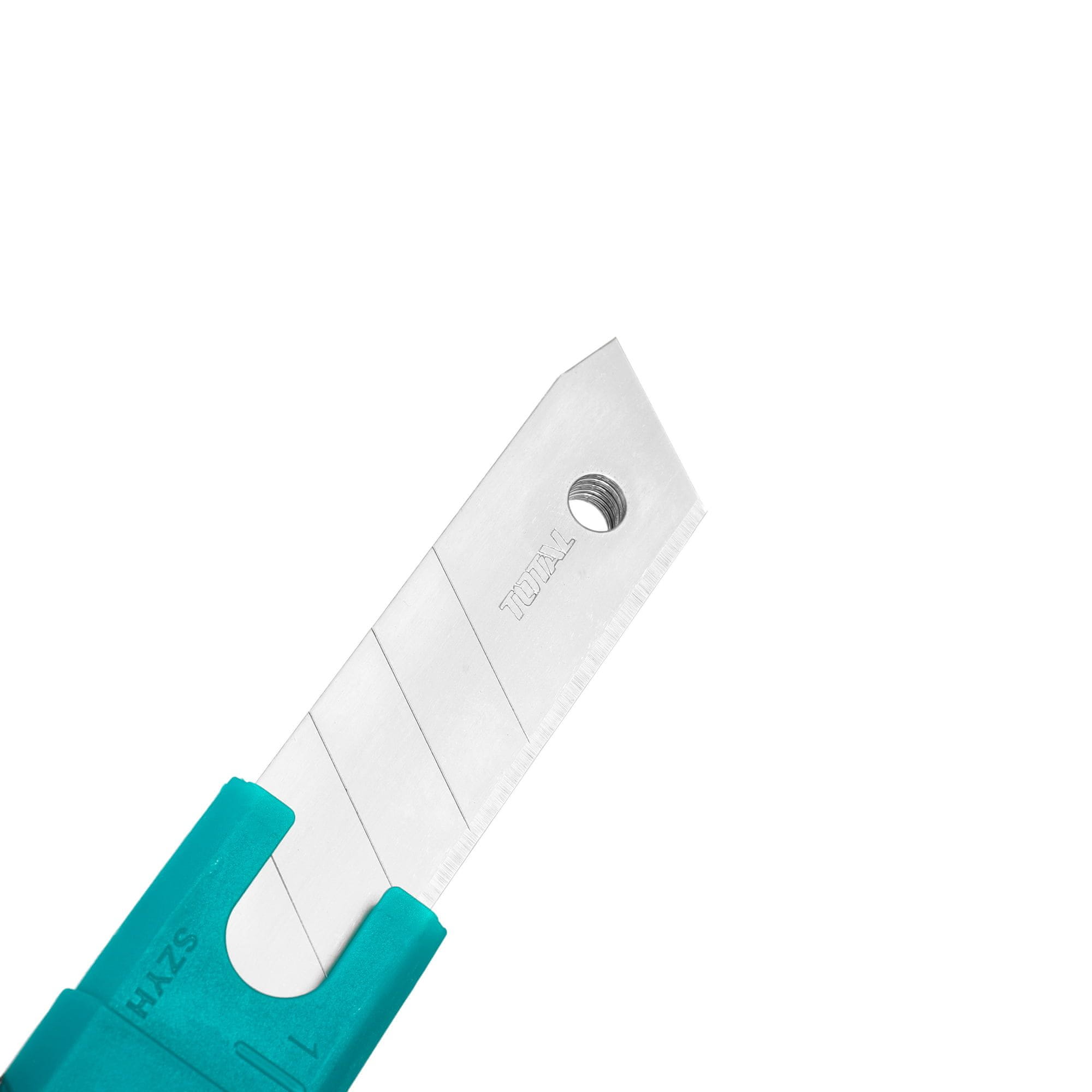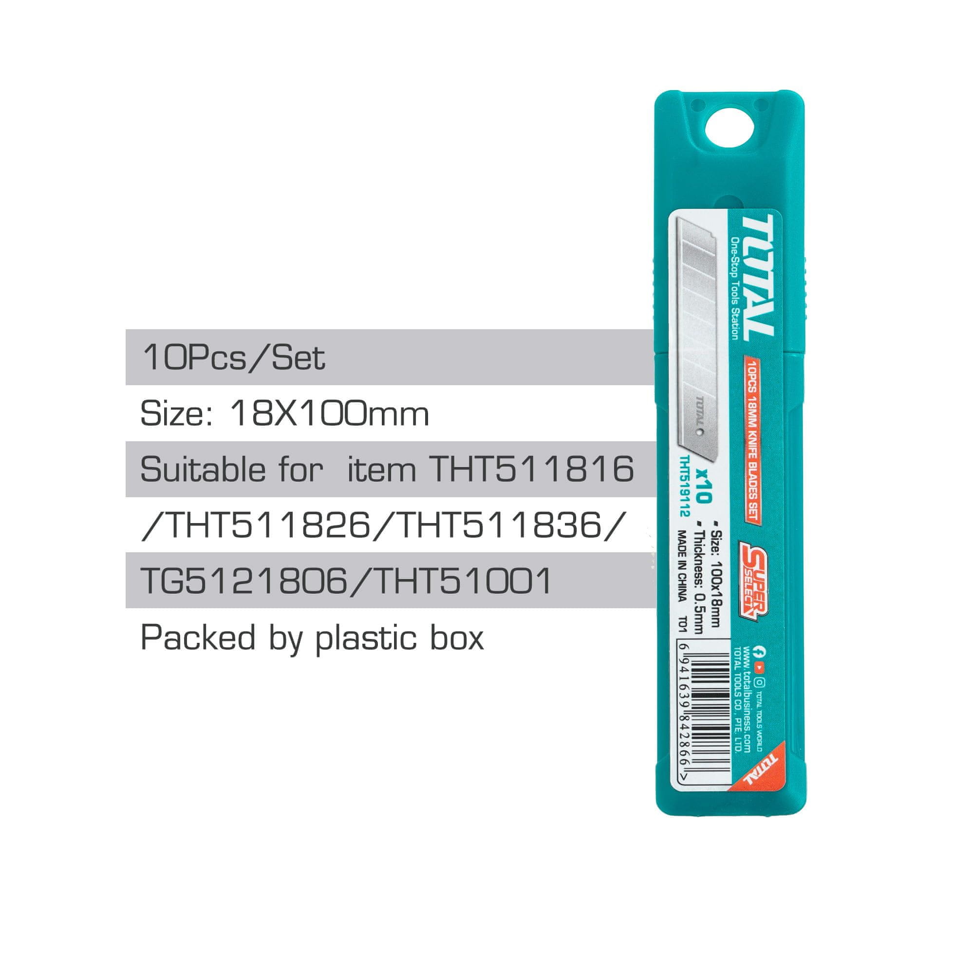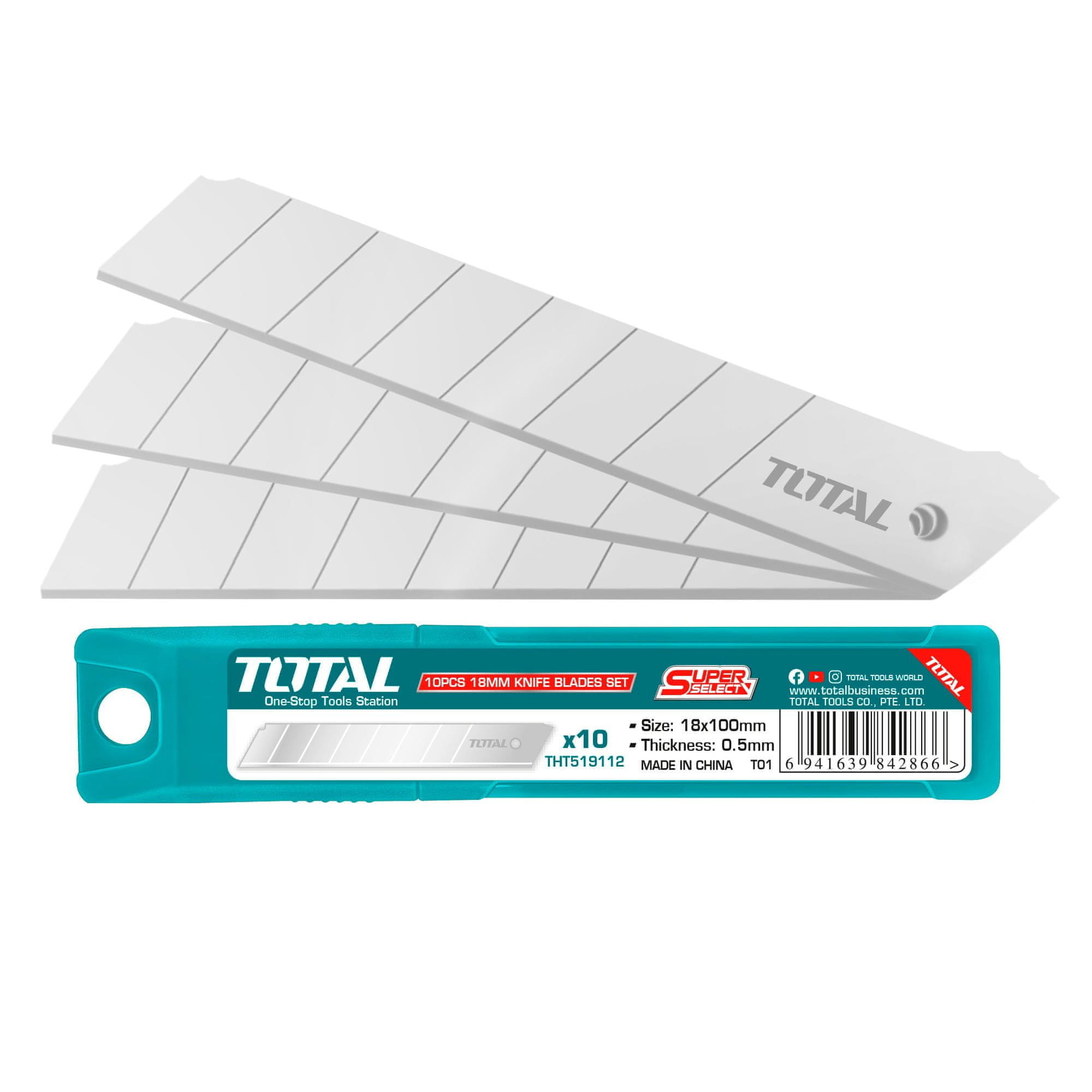 Nabor rezil TOTAL THT519112 vsebuje 10 rezil za gradbeni (pisarniški) nož. Velikost rezil je 18×100 mm, vrsta – lomljive. Rezila so izdelana iz visokokakovostnega ogljikovega jekla, zato dolgo časa ohranjajo svoje prvotne lastnosti in zagotavljajo ravno, natančno rezanje. Ta rezila so primerna za naslednje modele TOTAL nožev – THT511816, THT511826, THT511836, TG5121806, THT51001. Pakirana so v plastičnem ohišju.