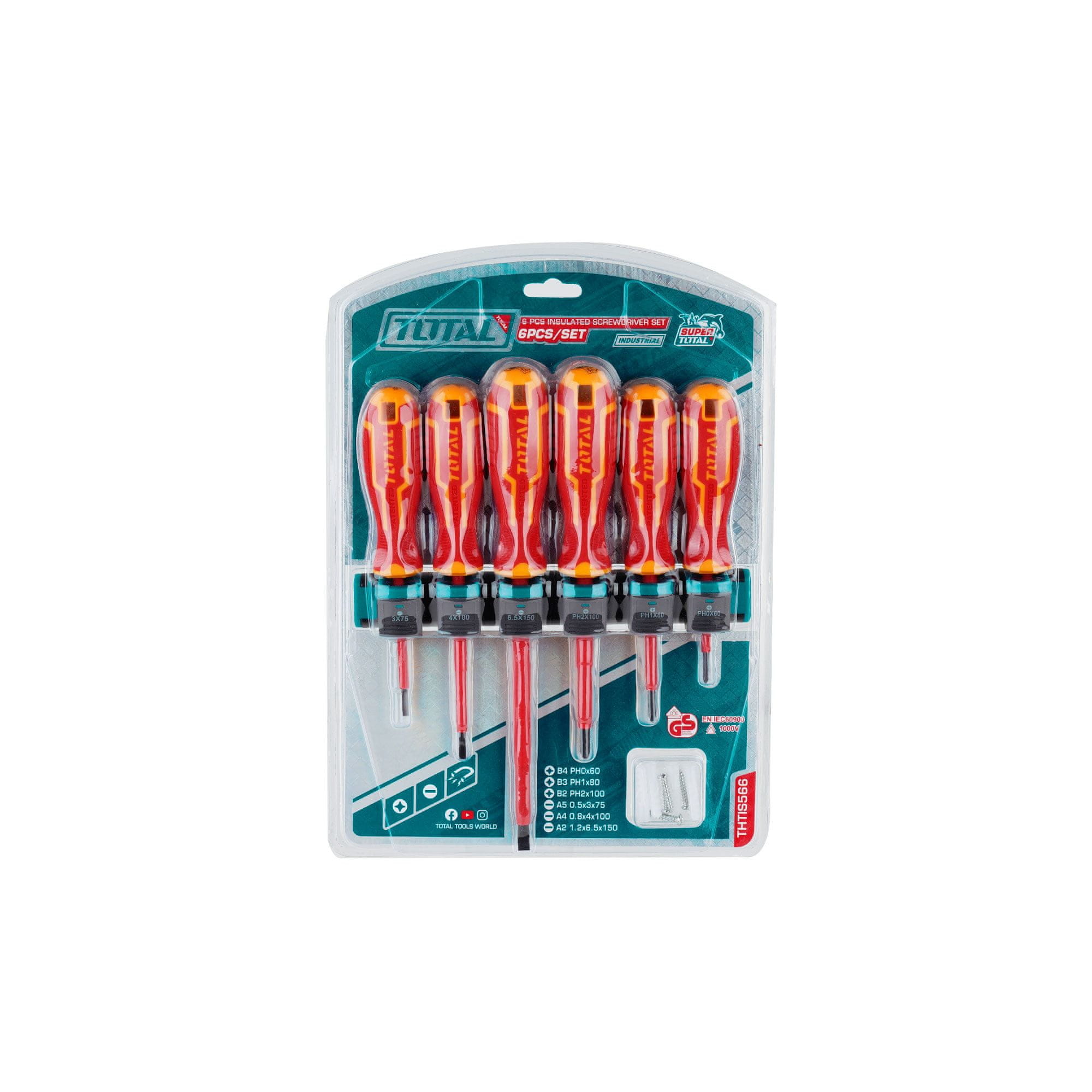 Profesionalni izolirani komplet izvijačev TOTAL THTIS566 je primeren za popravila, montažo, demontažo in druge delo, kjer se manipulira s kabli in električnimi komponentami. Komplet vključuje tri križne in tri ravne izvijače (od 60 do 150 mm) z magnetnimi konci. Izvijači so izdelani iz visokokakovostnega ogljikovega jekla Cr-V, zato prenašajo velike obremenitve, so odporni proti obrabi. Konice natančno ustrezajo profilu pritrdilnih elementov, kar zmanjšuje tveganje za poškodbe med montažo. Vsi orodja so dielektrična – izolirani ročaji novega dizajna preprečujejo prevodnost elektrike. Te modele je mogoče varno uporabljati pri napetosti do 1000 V. Izvijači TOTAL THTIS566 so testirani in odobreni s strani certificiranega laboratorija VDE+GS, kar kaže na zanesljivost in visoko kakovost orodij. Za enostavno shranjevanje izvijačev je v kompletu aluminijast nosilec. set je pakiran v plastični blister.