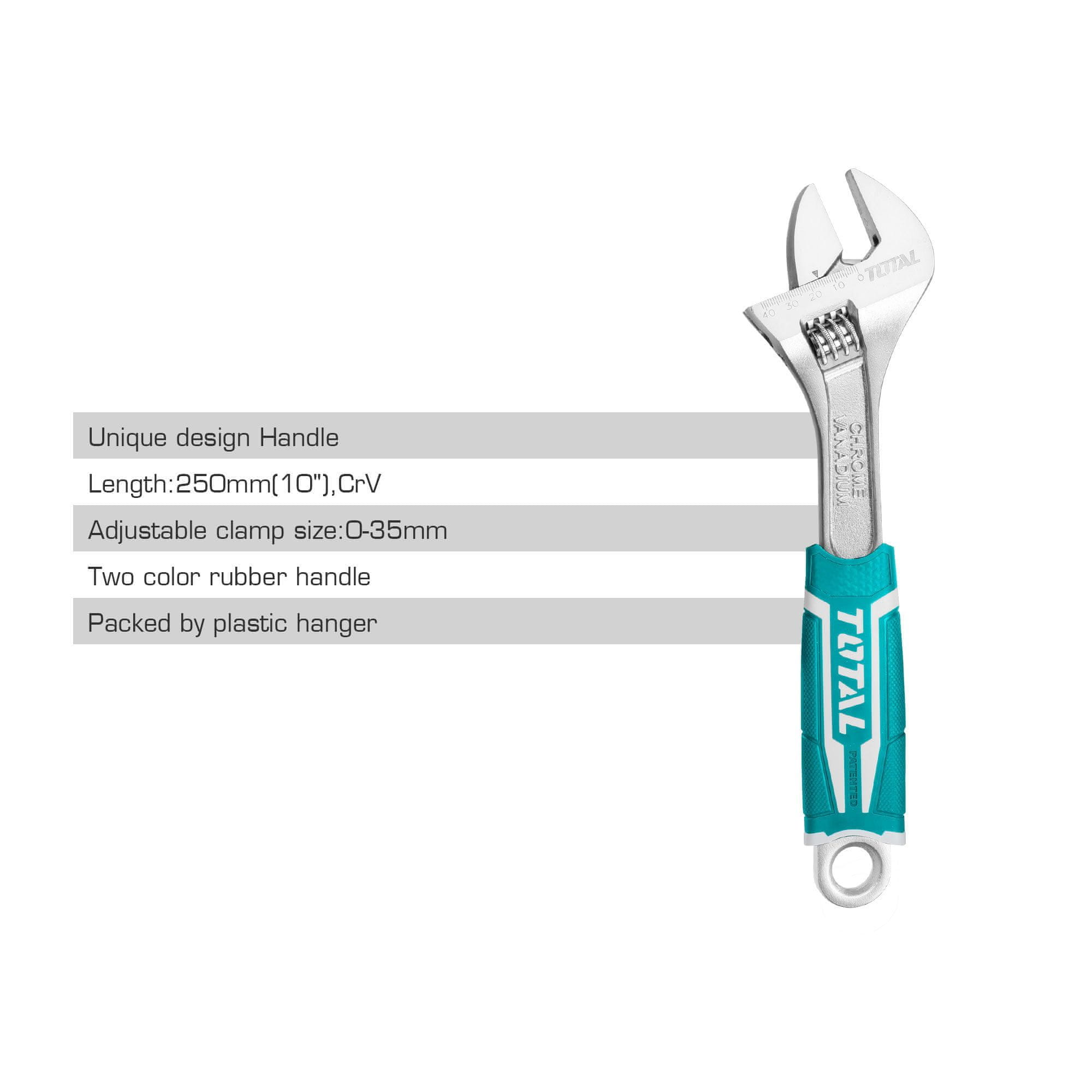Profesionalni ploskovni ključ TOTAL THT101106 se uporablja za montažo in demontažo pritrdilnih spojev različnih premerov. Dolžina orodja je 250 mm. Velikost prijemala je nastavljiva v območju od 0 do 35 mm. Delovni del je izdelan iz krom-vanadijevega jekla (CR-V), prekrit z antikorozijsko prevleko, zato je ključ sposoben vzdrževati velike obremenitve in ima dolgo življenjsko dobo. Dvokomponentni ročaj ima udobno obliko in je prevlečen z gumiranim materialom, zaradi česar zagotavlja zanesljiv oprijem brez zdrsa. Za lažje shranjevanje je orodje opremljeno s plastičnim obešalom.