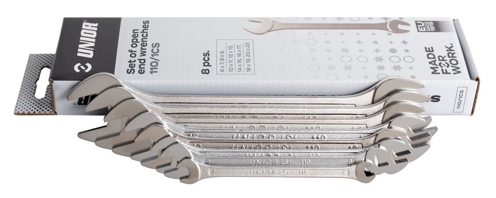 Unior garnitura viličastih ključev110/1CS (602844) vsebuje 8 kosov viličastih ključev s poliranimi glavami. Izdelani so iz kovanega kroma vanadij, ki je v celoti poboljšan in površinsko zaščiten, saj je kromiran po standardu EN12540.
