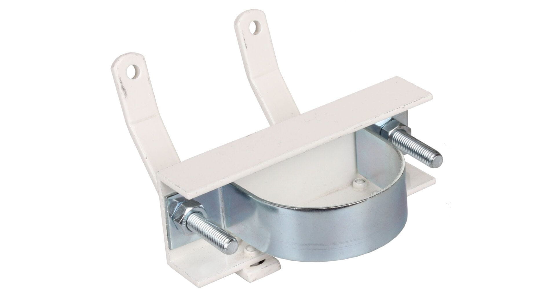 Dvojno držalo za mrežo in metle, namenjeno za namestitev na ograjne stebre s premerom od 40 mm do 65 mm.