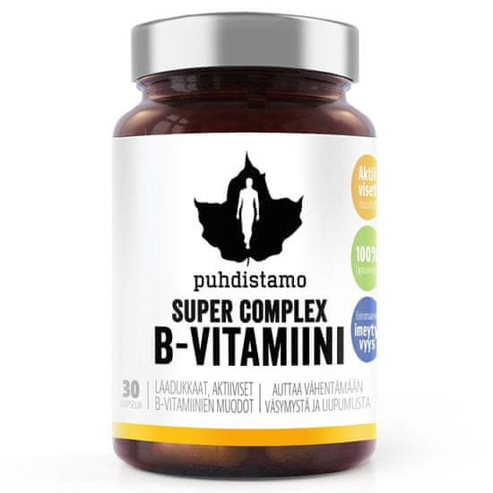 Puhdistamo – Super Vitamin B-Complex 30 kapsulKompleks 10 snovi iz skupine vitaminov B Vitamini B1, B2, B3, B5, B6, B12 Biotin, folat, inozitol in PABA (paraaminobenzojska kislina) Vitamini v bioaktivnih oblikah Holistična (celostna) sestava izdelka odlična biološka uporabnost Vrhunska kakovost – izdelek vsebuje samo aktivne sestavine Vrhunska čistost – brez balastnih dodatkov, veziv, polnil in umetnih sladil Brezkompromisna sestava prehranskega dopolnila Super Complex Vitamin B zagotavlja skupno 10 snovi iz skupine vitaminov B v bioaktivnih oblikah in rastlinskega izvora. Lastnosti vseh vitaminov skupine B so povezane z energijsko presnovo, odpornostjo, duševno kondicijo in kognitivnimi sposobnostmi. Poleg tega ima vsak še svoje specifične učinke. Vitamin B1 (tiamin) – v obliki tiamin HCl – timinijevega hidroklorida ima ta vitamin podobne lastnosti kot acetilholin, njegove lastnosti so pomembno povezane s kognitivnimi sposobnostmi. Vitamin B2 (riboflavin) – v obliki riboflavin-5-fosfata – aktivna oblika riboflavina, ki jo telo lahko uporabi, lastnosti tega vitamina so povezane z oksidativnim stresom, dopaminom in sluznicami. Vitamin B3 (niacin) – v obliki inozitola heksanikotinata, ki je vir nikotinske kisline (niacina), lastnosti tega vitamina so povezane s homocisteinom in plodnostjo. Pantotenska kislina (vitamin B5) – v obliki d-pantotenske kisline, lastnosti te snovi so povezane z živčnim sistemom in ravnjo hormonov. Vitamin B6 (piridoksal) – v obliki piridoksal-5-fosfata, aktivne oblike vitamina B6, ki je kofaktor pomembnih encimov, njegove lastnosti pa so povezane z živčnim sistemom, kognitivnimi sposobnostmi in sluznicami. Biotin (vitamin B7, vitamin H) – koencim za številne encime, njegove lastnosti so povezane s presnovo aminokislin. Folat (folna kislina, vitamin B9) – v obliki QuatrefolicTM 5-MTHF metifolata – oblika folne kisline z odlično biorazpoložljivostjo, njene lastnosti so povezane s plodnostjo, reproduktivnim traktom, razvojem ploda in drugimi področji. Inozitol (vitamin BM) – lastnosti inozitola so povezane s proizvodnjo acetiholina in serotonina, reproduktivnim traktom in razvojem ploda PABA – paraaminobenzojska kislina (vitamin Bx) – lastnosti te snovi so povezane s presnovo folne kisline, stanjem sluznice in energijsko presnovo. Izdelek ne vsebuje laktoze, mleka in glutena. Izdelek ne vsebuje želatine ali dodatkov živalskega izvora. Razvit in proizveden na Finskem. Država porekla surovine ZDA. pakiranje po 30 kapsul (14 g) odmerjanje vzemite 1 kapsulo dnevno. Pakiranje vsebuje 30 odmerkov. Opozorilo Ni primerno za otroke, mlajše od 3 let. Ni nadomestilo za raznoliko prehrano. Ne prekoračite priporočenega odmerka. Shranjujte na suhem in hladnem mestu, nedosegljivem otrokom. Zaščititi pred svetlobo. Primerno za vegane. Vsebuje okroglo vpojno sredstvo za zmanjšanje morebitne vlage, ne zaužijte! 30 1 kapsula (% RHP*) vitamin B1 50 mg (4545 %) vitamin B2 7 mg (500 %) vitamin B3 60 mg (375 %) vitamin B6 10 mg (714 %) vitamin B12 350 mikrogramov (14.000 %) biotin 350 mikrogramov (700 %) vitamin B5 100 mg (1.666 %) folna kislina 400 mikrogramov (200 %) inozitol 10 mg PABA 2 mg * RHP – referenčna vrednost vnosa vitaminov in mineralov. Sestavine tiamin hidroklorid, riboflavin-5'-fosfat, inozitol-heksa-nikotinat, piridoksal-5'-fosfat, metilkobalamin, 5'-deoksiadenozilkobalamin, biotin, kalcijev D-pantotenat, kalcijev L-metilfolat (Quatre-folic®), PABA (paraaminobenzojska kislina), L-levcin, kapsule (celuloza, voda).
