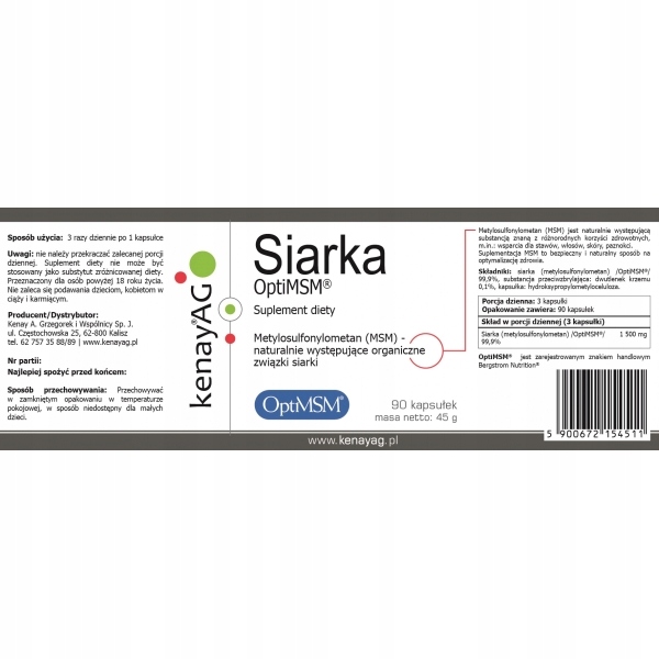 Sestavine : žveplo (metilsulfonilmetan) /OptiMSM®/ 99,9 %, sredstvo proti sprijemanju: silicijev dioksid 0,1 %, kapsula: hidroksipropil metilceluloza.