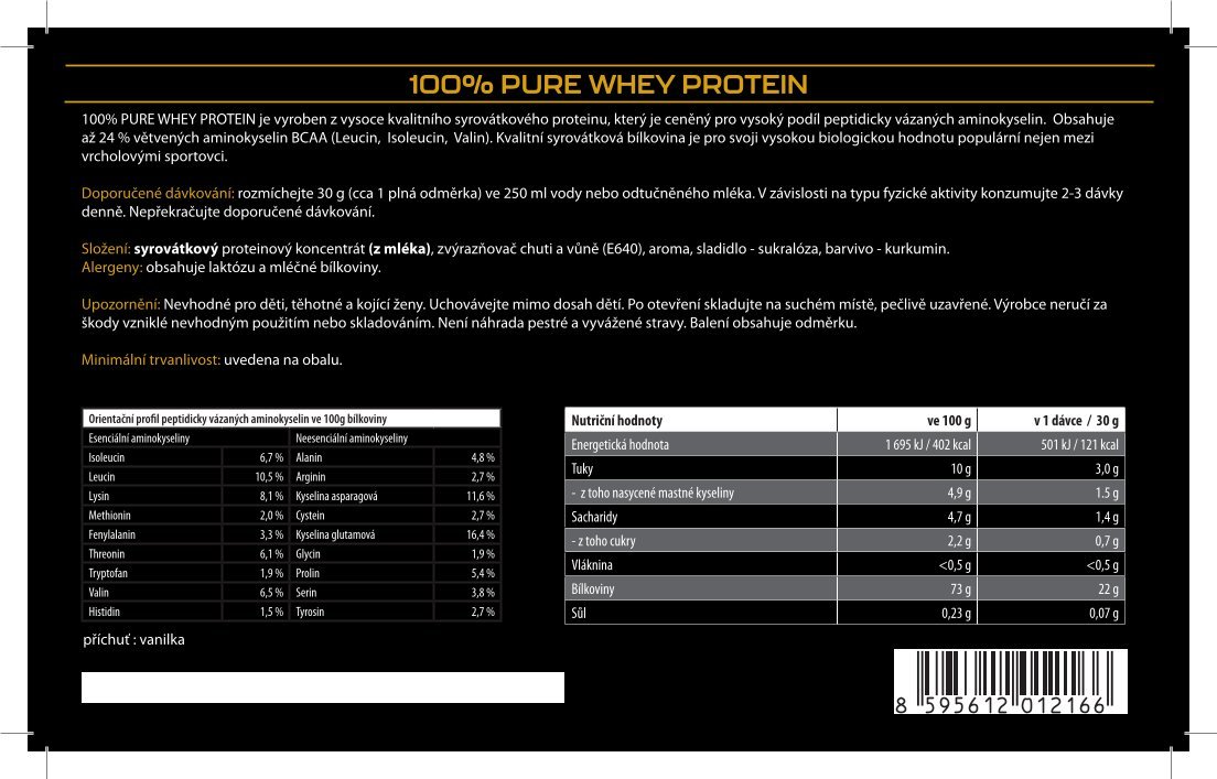 Beljakovinski napitek iz sirotke z visokim deležem peptidno vezanih razvejanih aminokislin Bcaa (levcin, izolevcin, valin). Sirotkine beljakovine so zaradi lahke prebavljivosti in visokega deleža esencialnih aminokislin eden najboljših virov beljakovin. Napitek je primeren takoj po fizični aktivnosti ali kadar koli v dnevu za dopolnitev visokokakovostnih beljakovin v prehrani. Vrhunske sirotkine beljakovine iz skandinavskega mleka Beljakovinski napitek 100% PURE WHEY PROTEIN je koncentrat čiste sirotke, ki je izdelan z nežno ultrafiltracijo iz mleka danskega porekla. Sirotkine beljakovine imajo visok delež esencialnih aminokislin, vključno s peptidno vezanimi aminokislinami (BCAA), ki jih vsebujejo 23,7 %. Idealna prehrana po treningu ali za dopolnitev beljakovin čez dan. Sirotkine beljakovine so eden od idealnih virov beljakovin po fizični aktivnosti. En odmerek (30 g) zagotavlja 22 g beljakovin, kar je optimalni odmerek beljakovin po treningu. Beljakovine, zaužite po športni dejavnosti, olajšajo okrevanje ter prispevajo k rasti in ohranjanju mišične mase. 100 % čiste beljakovine sirotke so vsestransko uporabne. Poleg uporabe kot beljakovinski napitek po vadbi lahko beljakovine uporabite tudi v žitnih kosmičih za zajtrk ali za pripravo beljakovinskih sladic in peciva. 100 % ČISTE BELJAKOVINE BELJAKOVINE v točkah: