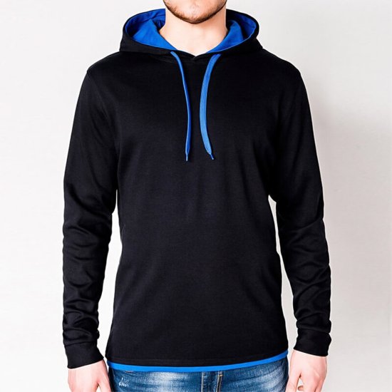 Kvaliteten in trend pulover v črni barvi s kapuco, ki je v notranjosti v modri barvi. Izgled dopolnijo vrvice in spodnji rob v kontrastnih barvah. Izdelan je iz mehkih na dotik prijetnih pletenin srednje debeline. Primeren je za vsakodnevno nošenje. Odlično se kombinira s kavbojkami ter tudi športnimi oblačili.