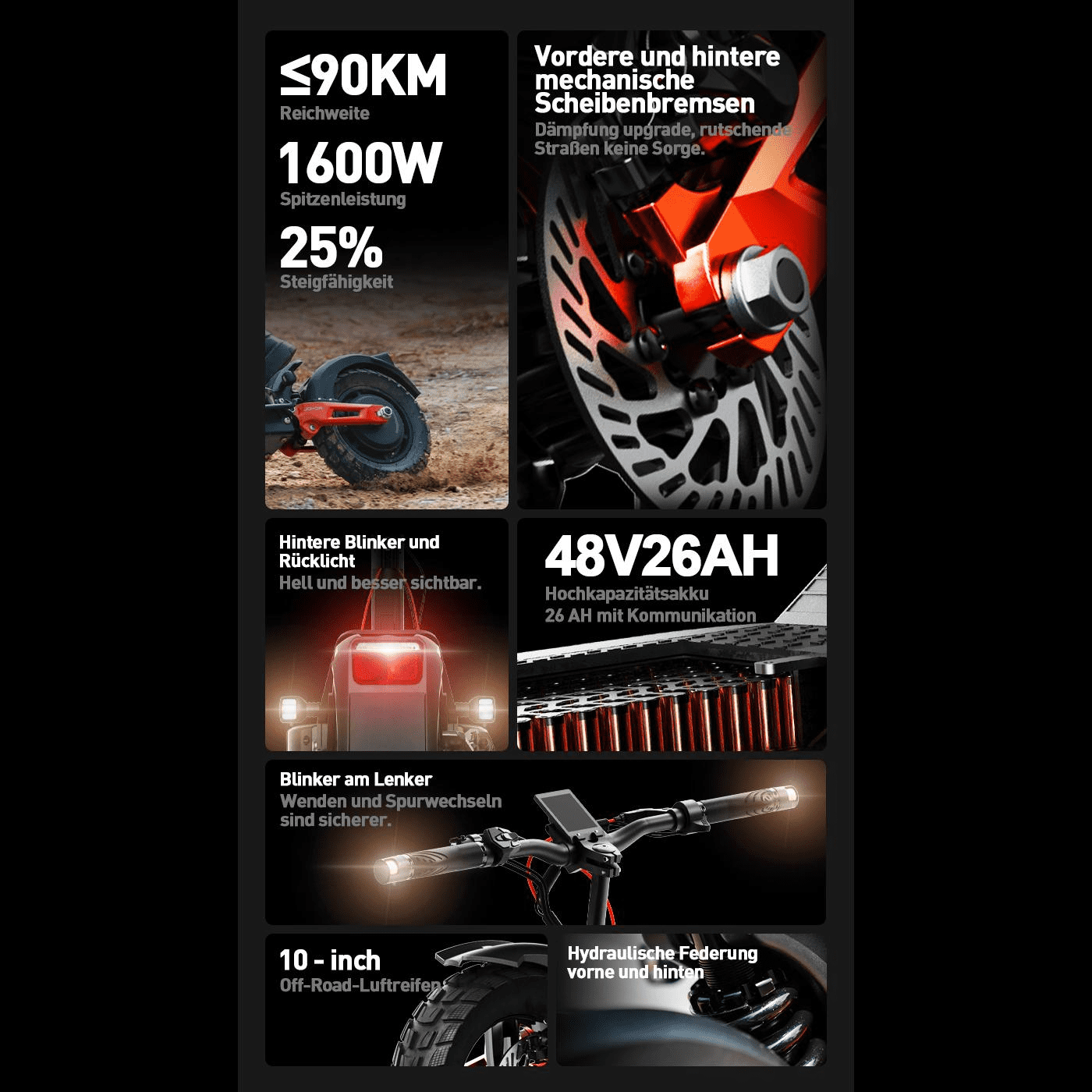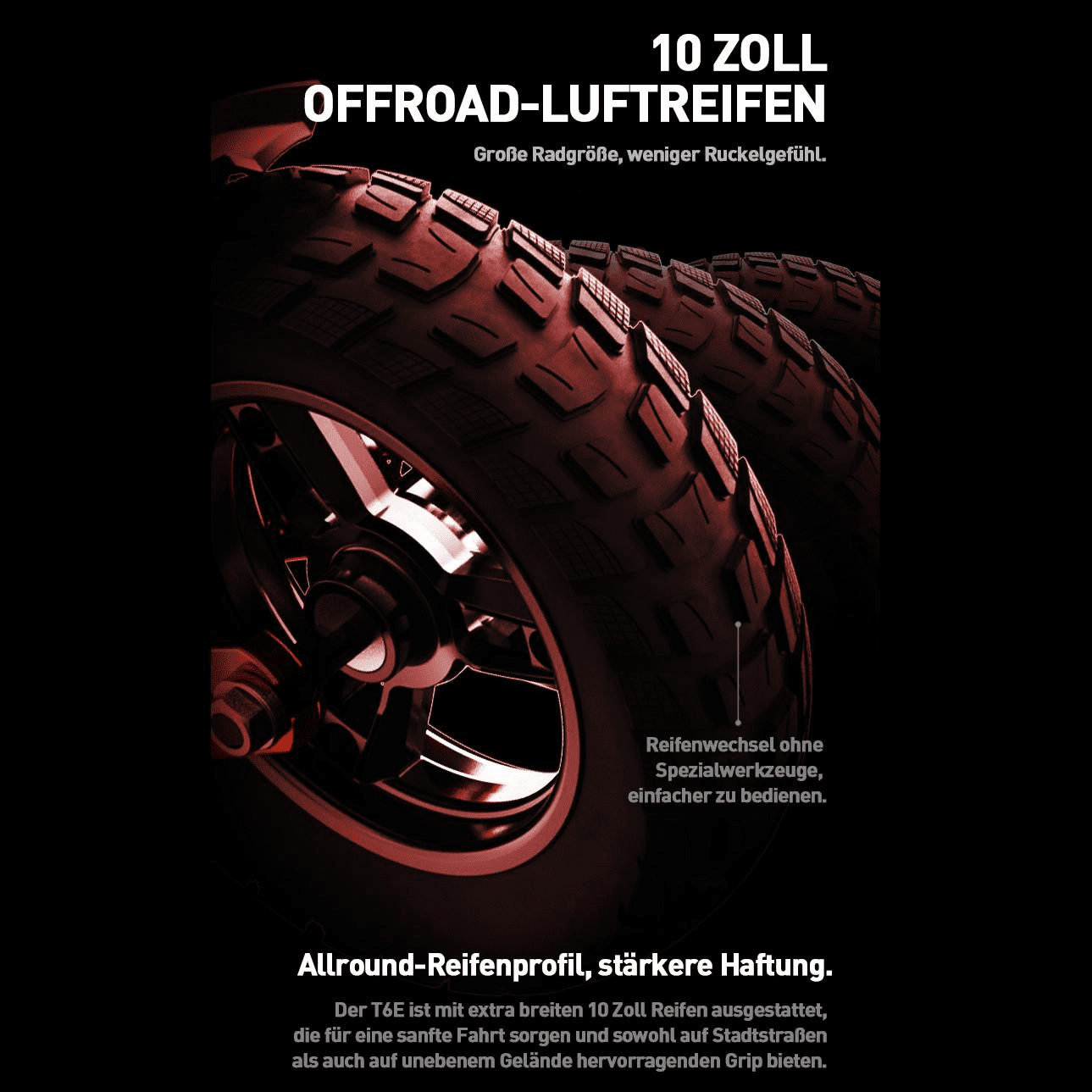 10-palčne terenske pnevmatike zagotavljajo odličen oprijem in blaženje udarcev na vseh površinah. V kombinaciji s sprednjim in zadnjim hidravličnim vzmetenjem ta skuter ponuja stabilno in udobno vožnjo tudi na neravnem terenu.