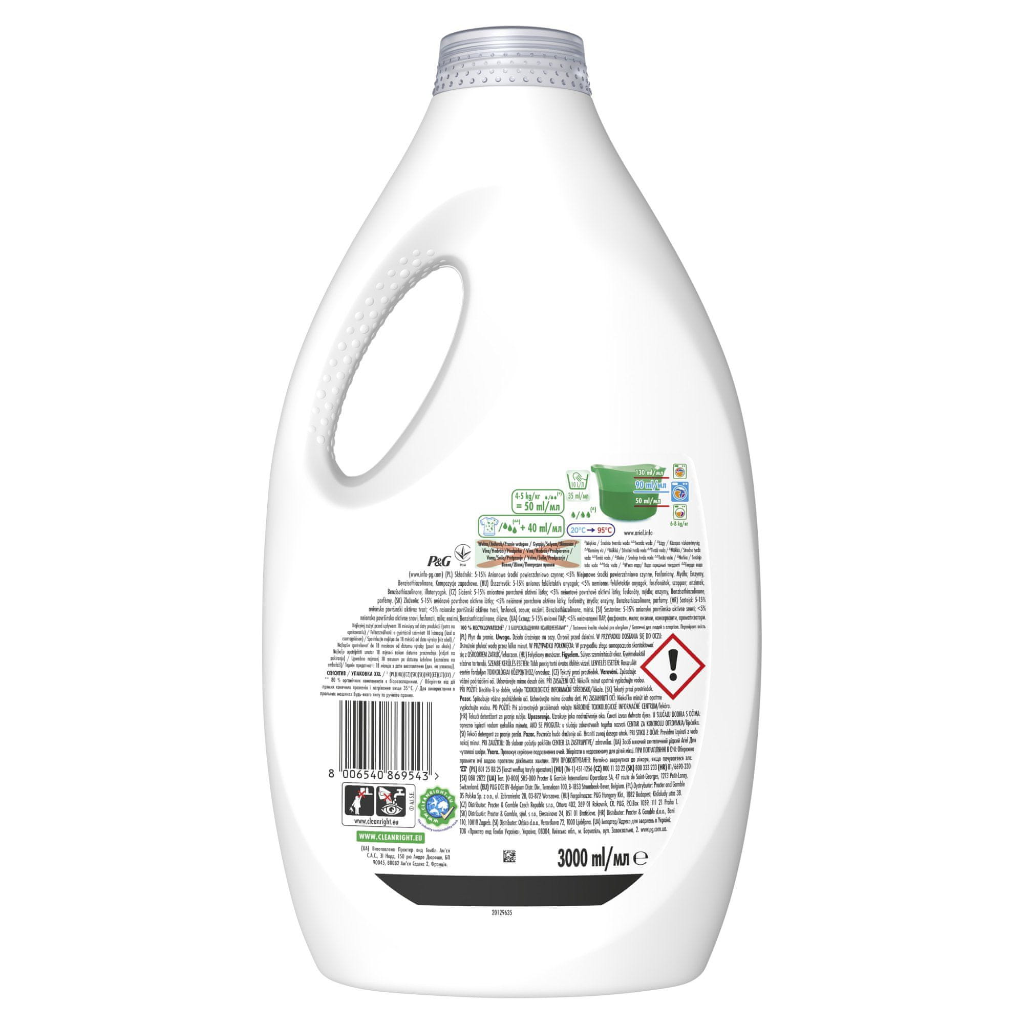Ariel Sensitive Washing Gel odstranjuje trdovratne madeže s perila, hkrati pa je nežen in prijazen do kože. Učinkovit je že pri nizkih temperaturah. Vključuje 0 % barvil in manj alergenov. Dermatološko testiran in certificiran s strani neprofitnega Celoten opis
