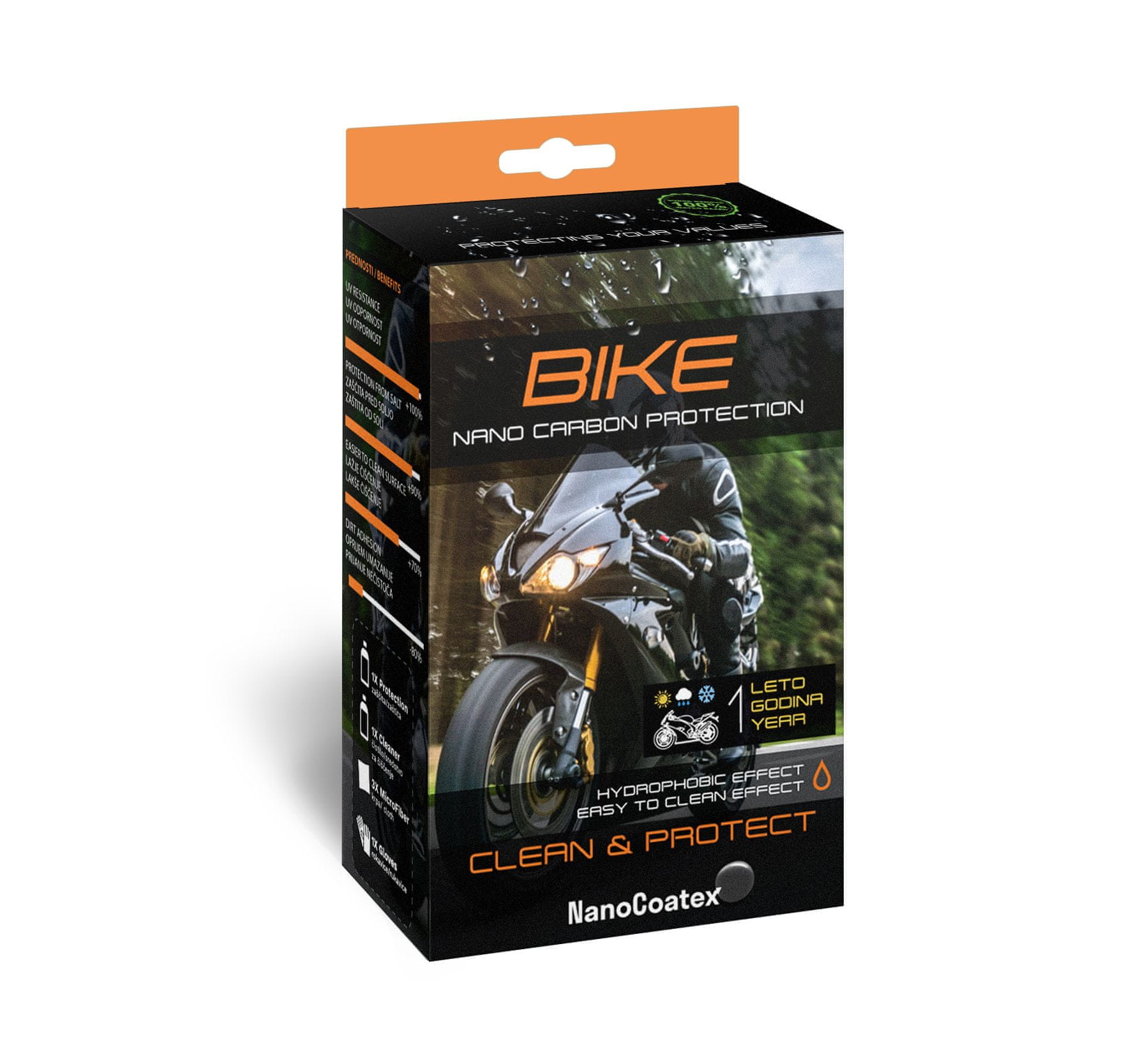 Komplet za čiščenje in zaščito NanoCoatex Bike nano carbon porotection je nova izboljšana enoletna zaščita, narejena na osnovi NANO KARBONSKE tehnologije. Namenjena je zaščiti barve in kromiranih delov motornega kolesa pred negativnimi dejavniki iz okolja kot so UV žarki, sol, blato in umazanija. Je prva dolgotrajna profesionalna zaščita na 100% vodni osnovi. Površini nudi močno in dolgotrajno super-vodoodbojno nano zaščito, ki znatno odbija vodo, umazanijo in toksične snovi. Priljubljeno med kupci zaradi lažjega čiščenja, dolgotrajnega učinka in enostavne uporabe. En nanos nudi zaščito do enega leta, odvisno od nege in vzdrževanja. Za čiščenje ne boste potrebovali agresivnih čistil.