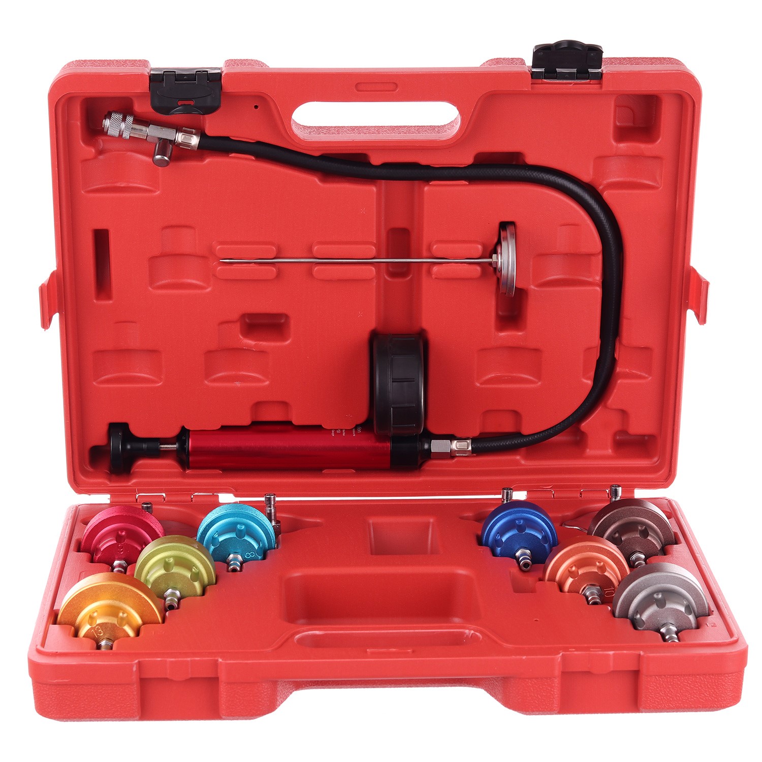 Profesionalni tester puščanja hladilnega sistema in grelnega jedra. Uporablja se pri delu na osebnih avtomobilih, kombijih in tovornjakih. Poleg tega komplet vključuje termometer z dolgim steblom, ki se vstavi v hladilnik. To vam omogoča, da preverite delovanje termostata. Komplet vsebuje 12 pokrovčkov za različne vrste hladilnikov, ki so pritrjeni na črpalko s sistemom za hitro priključitev.