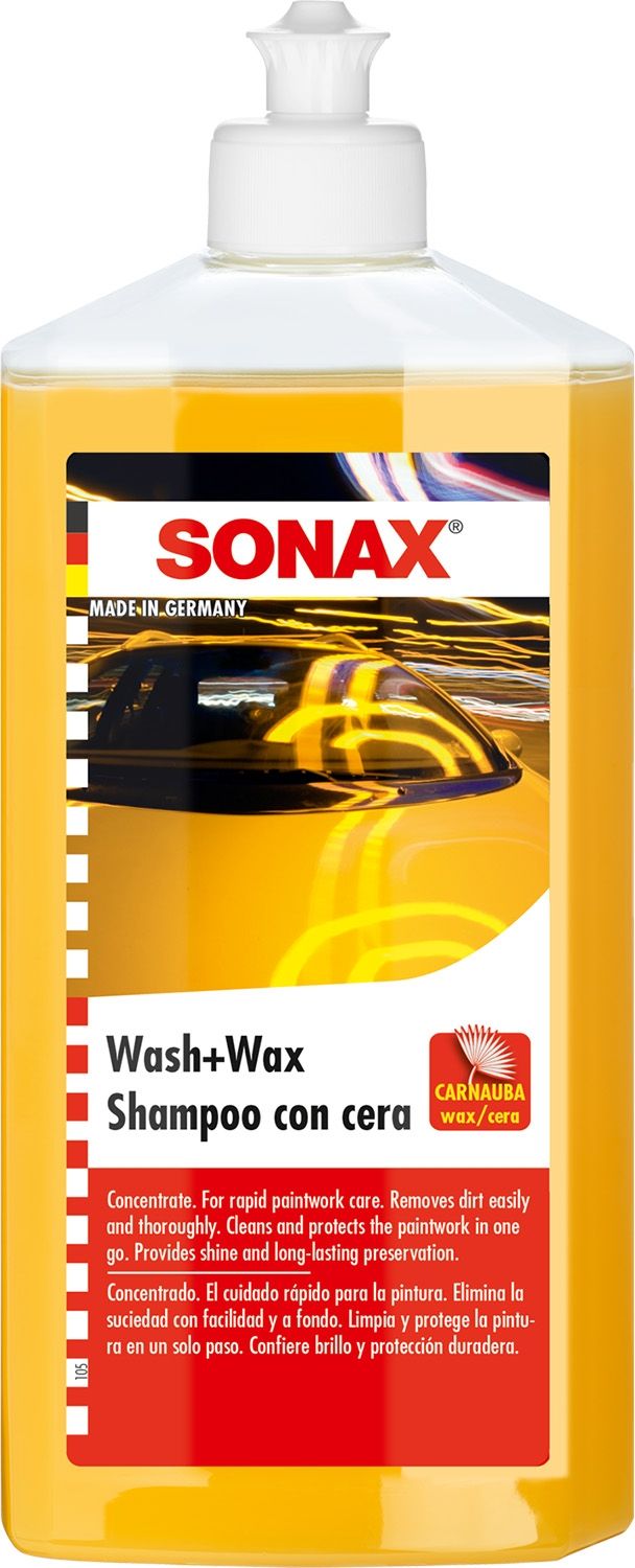 Avtošampon z voskom Sonax je koncentrirano čistilo za ročno pranje vozil, z dobrim učinkom pranja, saj hitro raztopi delce umazanije, hkrati pa še zaščiti in ustvari tanek film voska čez vse lakirane dele vozila. Temeljito, z eno delovno operacijo odstrani umazanijo in prevleče lak z dolgotrajnim zaščitnim filmom iz naravnega karnauba voska. Lak dobi visoki sijaj in dolgotrajno zaščito.V plastenki je 500 ml čistila.