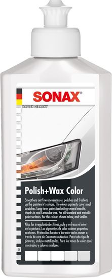Barvna politura Sonax je politura s srednje abrazivnim učinkom z barvnim pigmentom in delci voska. V enem koraku zgladi, spolira in povoska vse lakirane površine, navadne in metalik. Barvni pigment v polituri prekrije manjše praske in jih ščiti pred korozijo. Politura poudari intenzivnost barve ter poskrbi za visoki sijaj in dolgotrajno zaščito lakiranih površin zaradi naravnega Karnauba voska. Barvna politura Sonax je okolju prijazna pasta, ki ne vsebuje topil.
