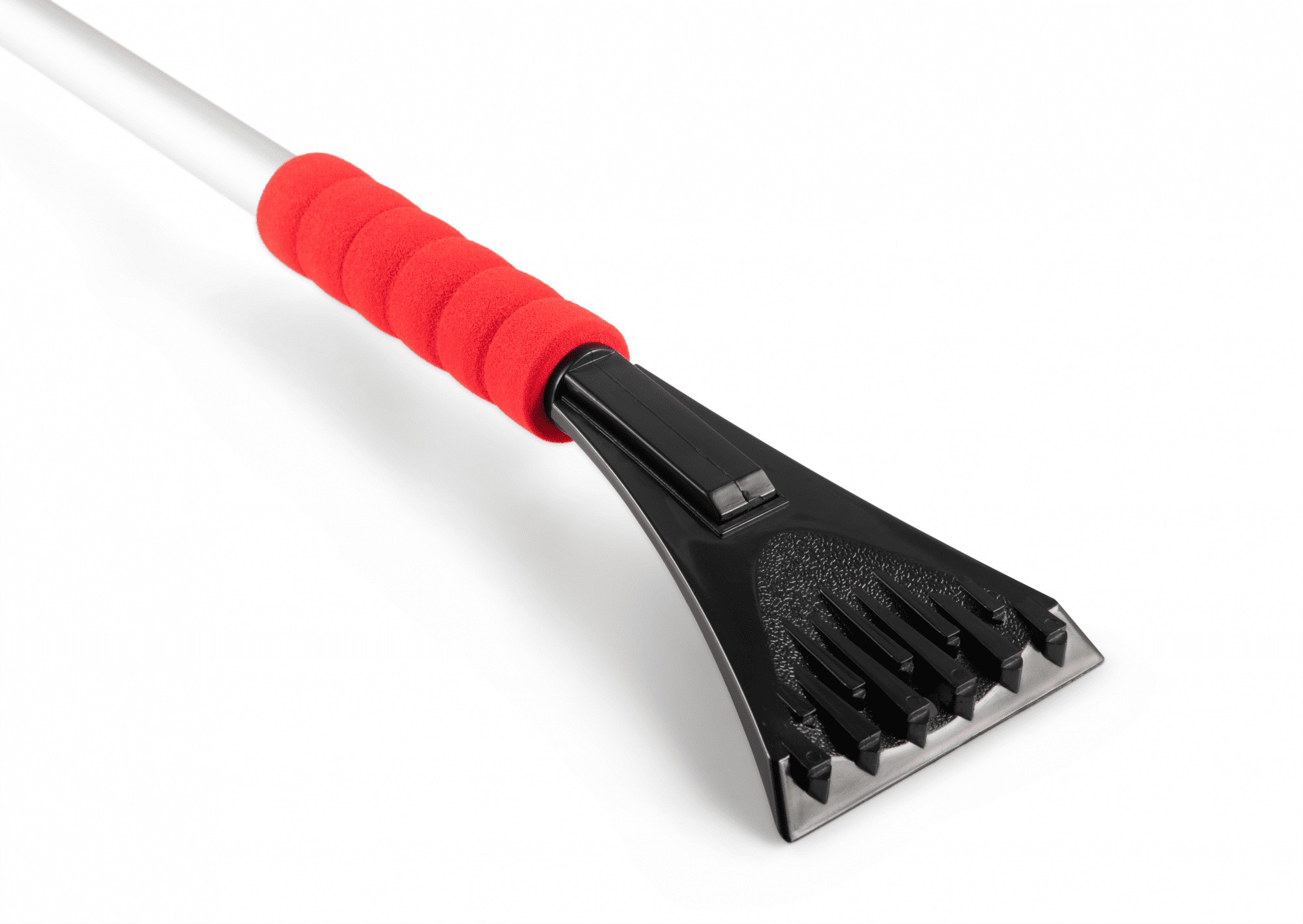 Strgalo za led s snemljivo metlico za odstranjevanje snega. Ergonomsko oblikovan gumijasti ročaj dolžine 90 cm omogoča lažji dostop do oddaljenih mest.