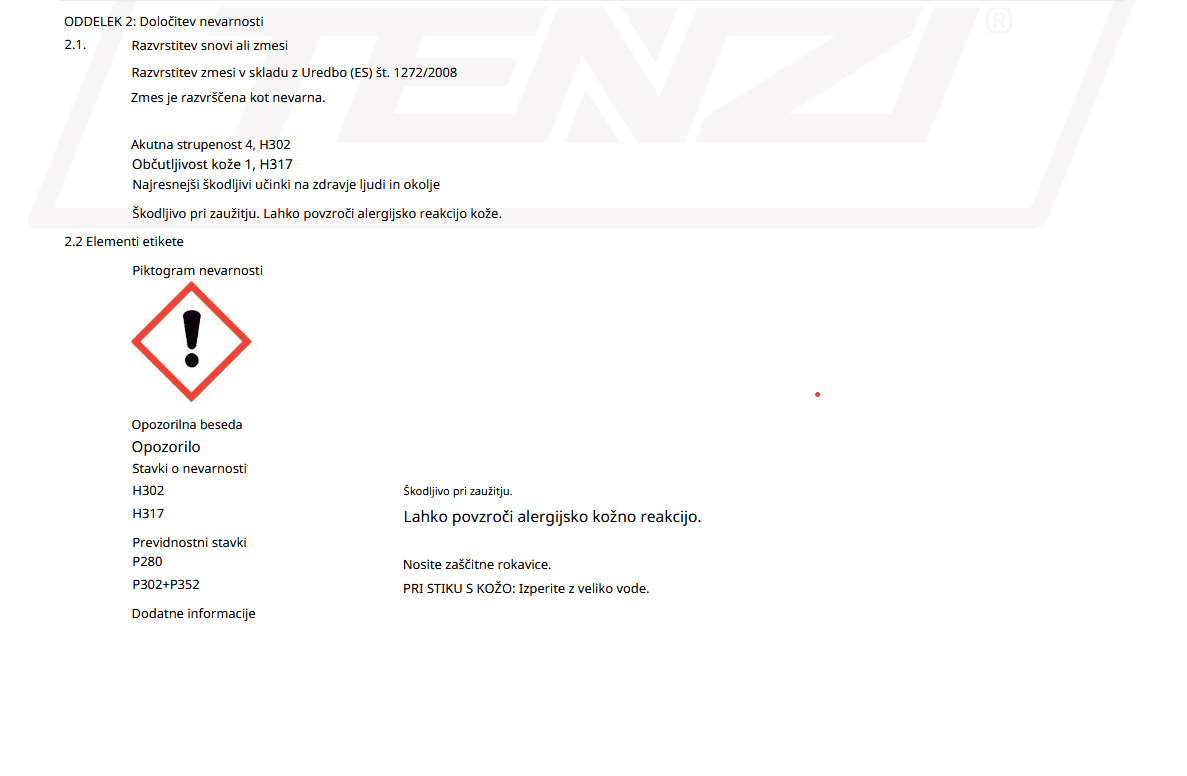 Proizvajalec Ime ali trgovsko ime TENZI Sp. z o.o. Naslov Skarbimierzyce 20, Dołuje, 72–002 Poljska DDV št. PL8512583405 Telefon +48 91 3119777 E-pošta info@tenzi.pl Spletni naslov www.tenzi.pl Pristojna oseba, odgovorna za varnostni list Ime technolog@tenzi.pl E-pošta technolog@tenzi.pl