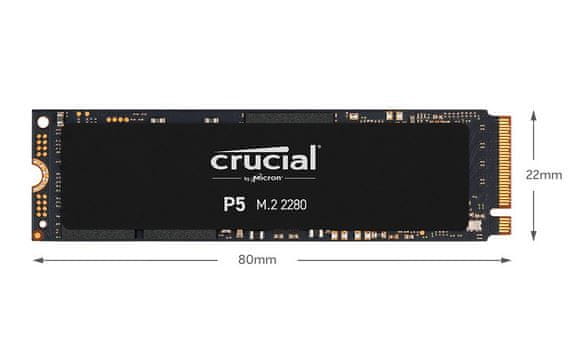 Crucial P5 je zelo hiter, ugoden in zanesljiv SSD disk. Ponaša se s tehnologijo PCi-e Gen3 NVMe, ki omogoča hitrosti branja do 3400 MB/s in pisanja do 3000 MB/s. To pomeni, da se operacijski sistem in programi zaženejo nemudoma. SSD disk je prestal veliko kvalifikacijskih testov, kar pomeni, da gre za izjemno vzdržljiv in zanesljiv model. Zagotavlja tudi polno enkripcijo diska. Opremljen je z naprednimi funkcijami kot so dinamično pospeševanje pisanja, popravljanje napak in adaptivna termalna zaščita.