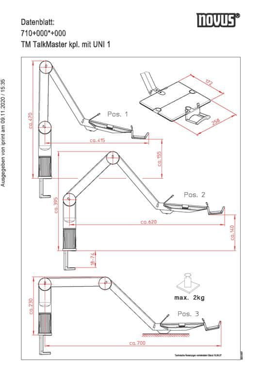 Vrtljiva roka za telefon z dvema pregiboma. Omogoča postavitev v 3 položaje. Doseg stojala v širino 415–700 mm, v višino 0–155 mm. Univerzalni vpenjalnik za mizo debeline od 18–74 mm. Nosilnost 2 kg. Roka se lahko vrti v krogu 360°. Velikost plošče 258 × 172 mm. Celoten opis