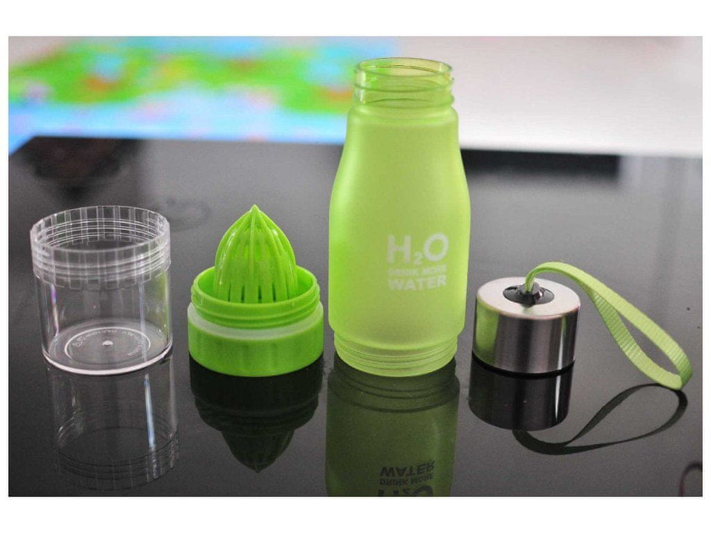 Odvijte dno steklenice in postavite steklenico z glavo navzdol na mizo. Limono ali drug agrum prerežite na pol in jo s pomočjo integriranega sokovnika položite neposredno v steklenico. Ponovno privijte spodnji del in obrnite steklenico. Na koncu dodamo vodo, privijemo pokrov in dobro premešamo. Dober tek!