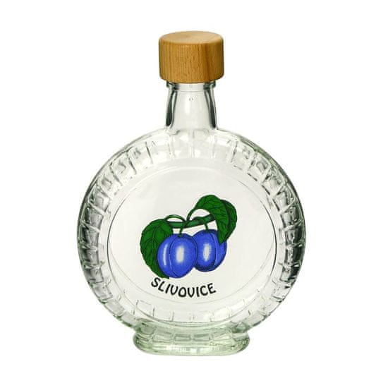 Steklenica iz prozornega stekla Peggy je idealna za žgane pijače in ima lesen pokrov, okrašen s sliko slive. Višina s pokrovom je 18 cm, prostornina 350 ml. Češki proizvajalec. EAN 8590504000016