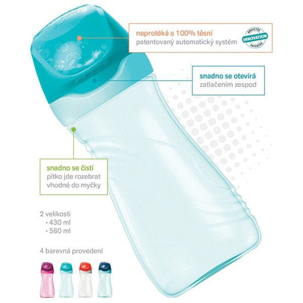 • ne vsebuje bisfenola A ali ftalatov, * enostavno odpiranje zgornjega pokrova s pritiskom od spodaj, * vrat ne pušča in je 100 % zatesnjen, * samodejni sistem preprečuje puščanje, ko je pijača končana, * za sprostitev pretoka pijače skozi napajalnik je treba vrat ponovno potisniti navzdol, * enostavno vzdrževanje in čiščenje – vrat steklenice lahko odstranite in temeljito operete, široko odprtino, * primeren za pomivalni stroj