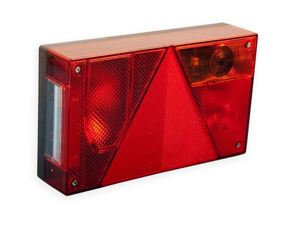 Združena pravokotna svetilka. Različica: desna, funkcije: zavora, smernik, lučka registrske tablice, lučka za meglo, lučka položaja in odsevni trikotnik. Celoten opis
