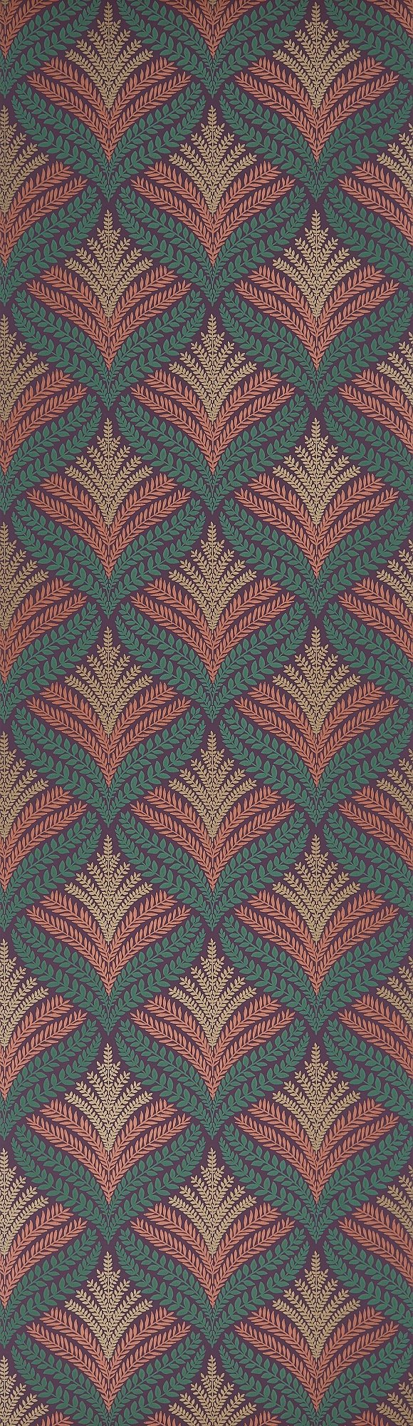 Ozadje, na katerem so prikazani listi papra v obliki pahljače, razporejeni v pravilnem geometrijskem vzorcu. Vzorec se ponovi po 26 cm. Cena velja za zvitek 10 mx 52 cm. Celoten opis