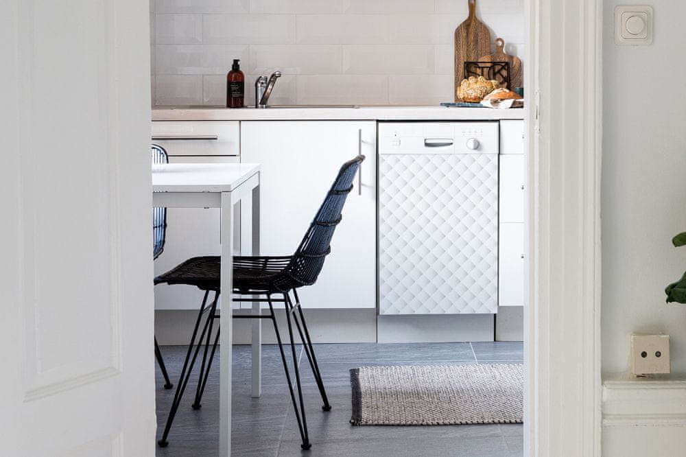 Montaža: Montaža poteka tako, da se podloga prisloni na površino vrat pomivalnega stroja. Demontaža ne pušča sledi.