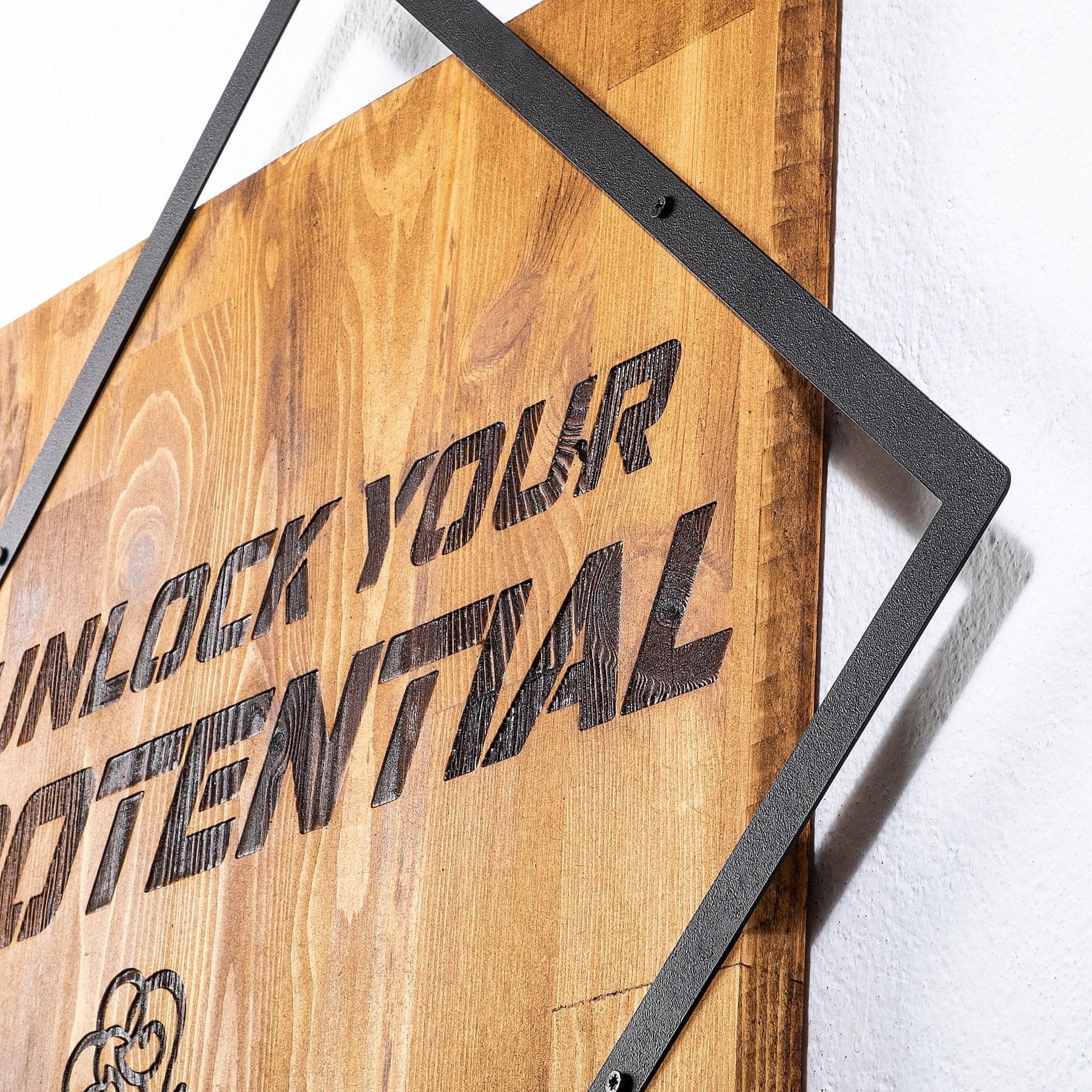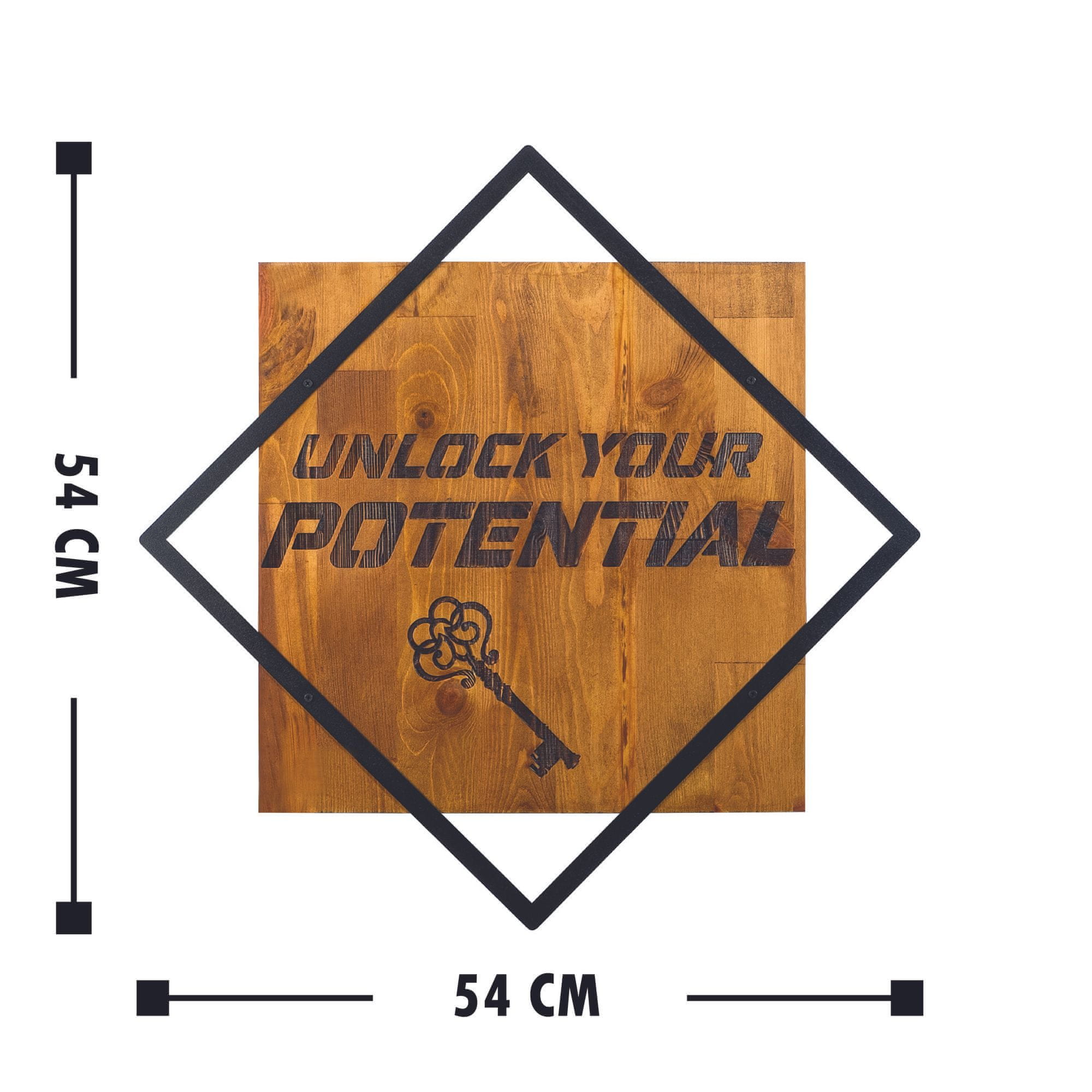 50 % lesa (debelina: 1,8 cm) – 50 % kovine (debelina: 0,1 cm) Velikost: 54 × 54 cm Izdelek je mogoče obesiti na steno, ker je za njim kos