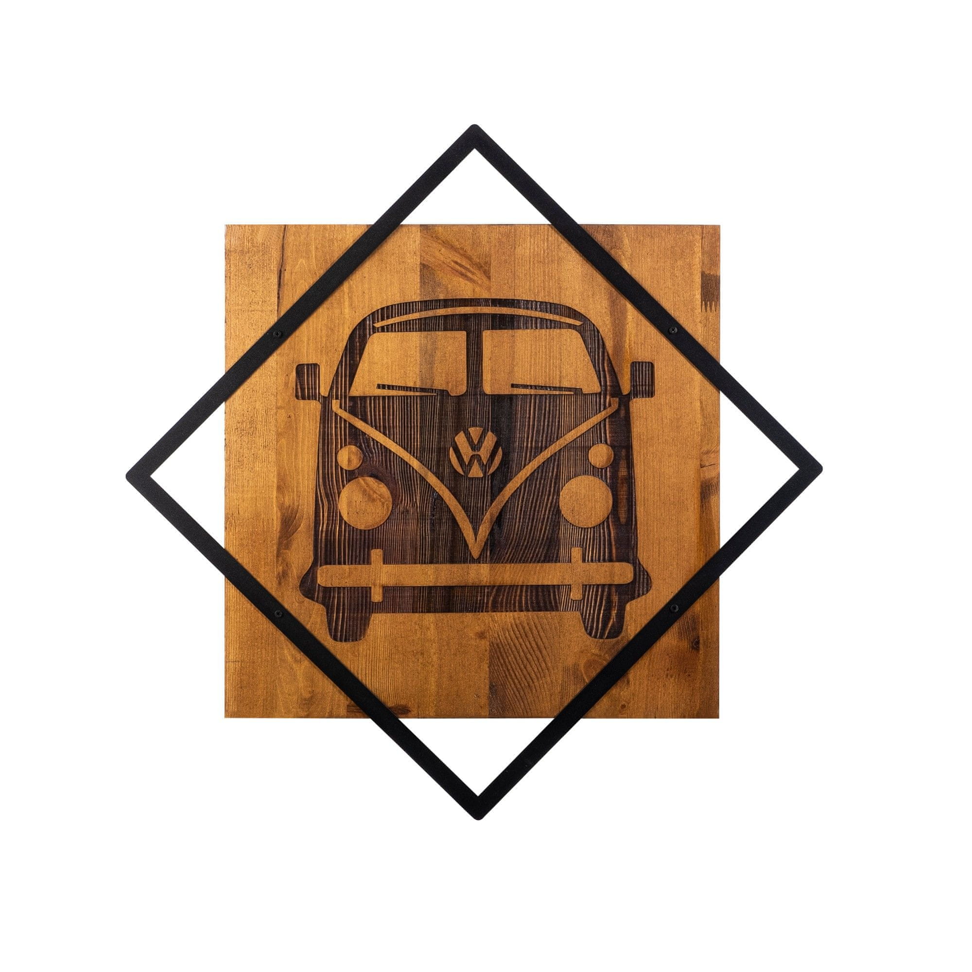 50 % lesa (debelina: 1,8 cm) – 50 % kovine (debelina: 0,1 cm) Velikost: 54 × 54 cm Izdelek je mogoče obesiti na steno, ker je za njim kos