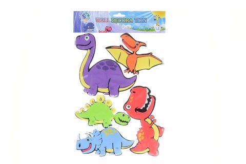 Okrastek iz pene za lepljenje z motivom dinozavra. Komplet vsebuje 5 slik. Vsak dinozaver je različnih dimenzij – največji 21×21 cm, najmanjši 19×11 cm. Debelina približno 0,3 cm. Pakirano v vrečki. Dimenzije paketa približno 30×50 cm. Starost 3+