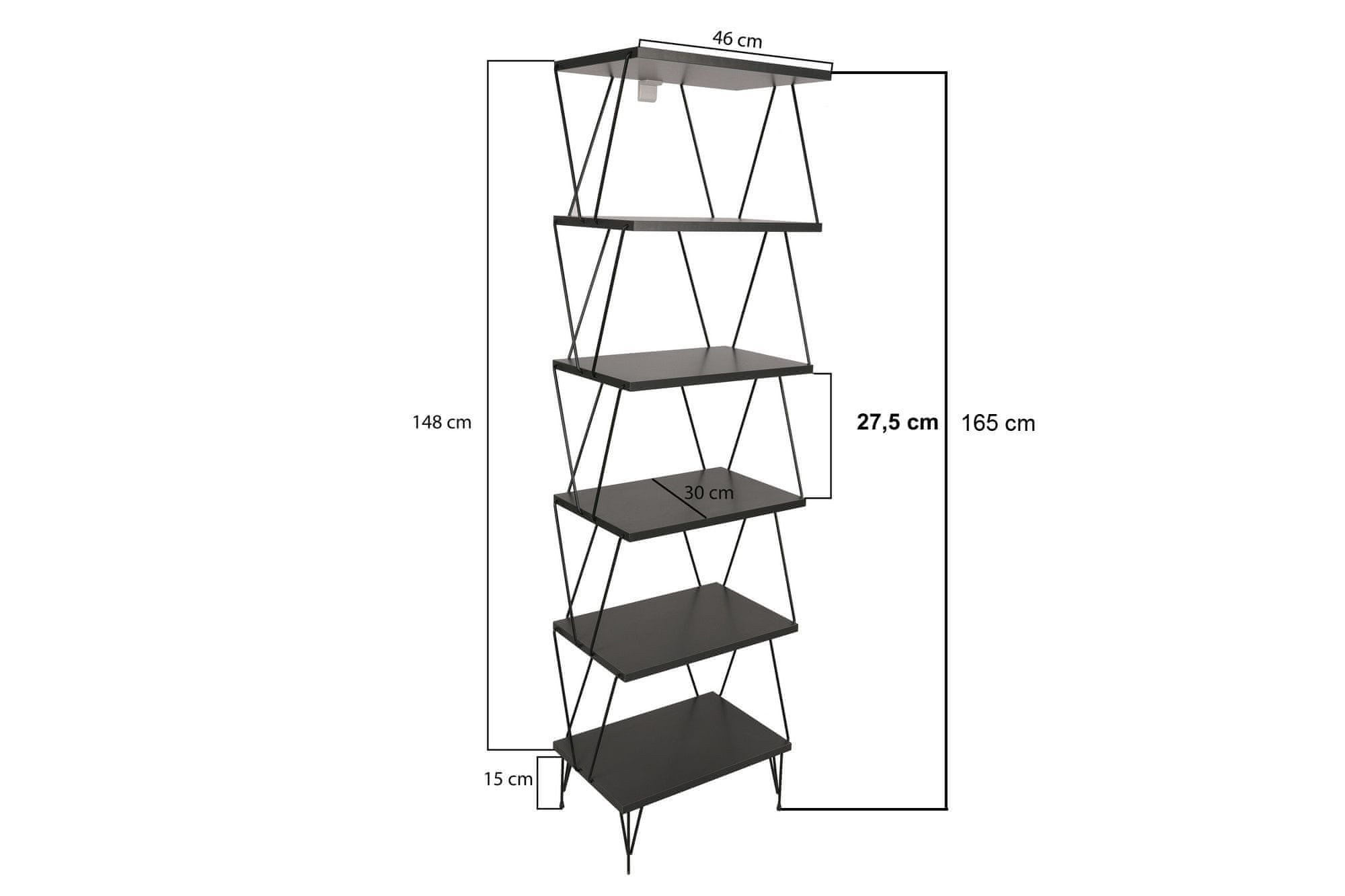 100 % MELAMINSKO PREVLEČENA IVERNA PLOŠČA Debelina: 18 mm Širina: 48 cm Višina: 165 cm Globina: 31 cm Višina police: 27,5 cm Višina nog: 15 cm Številne police Možnost pritrditve na steno Število paketov: 1