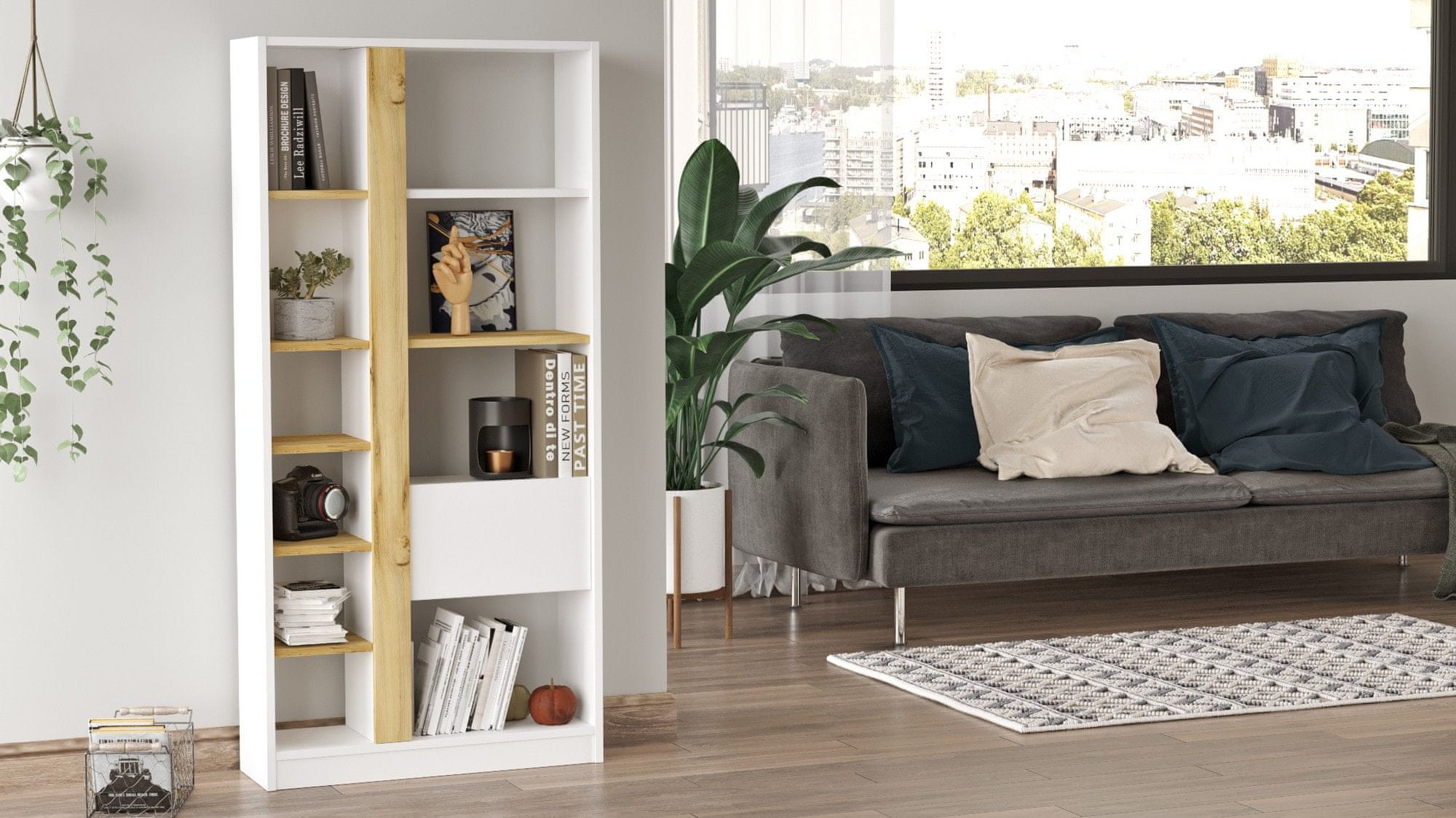 100 % MELAMINSKO PREVLEČENA IVERNA PLOŠČA Debelina: 18 mm Velikost knjižne police: Širina: 75,6 cm Višina: 160 cm Globina: 25 cm Višina omarice: 25 cm Višina police: 30,5 cm Številne police Možnost pritrditve na steno Dodatno shranjevanje Število paketov: 1