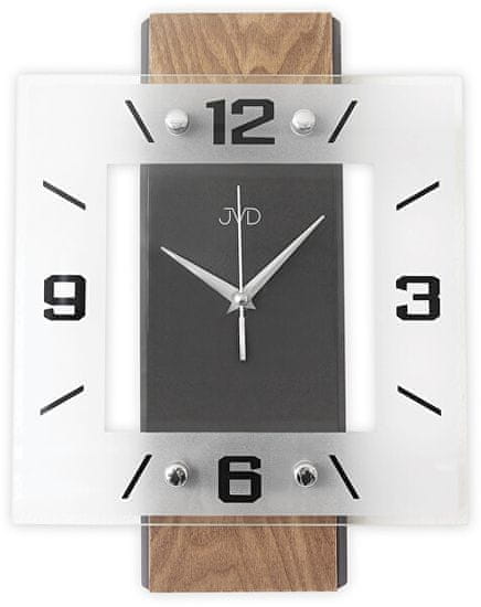 Stenska ura blagovne znamke JVD je umeščena na leseno podlago. Ima kvadratno številčnico z velikimi številkami in tihimi kazalci. Globina ure je 55 mm.