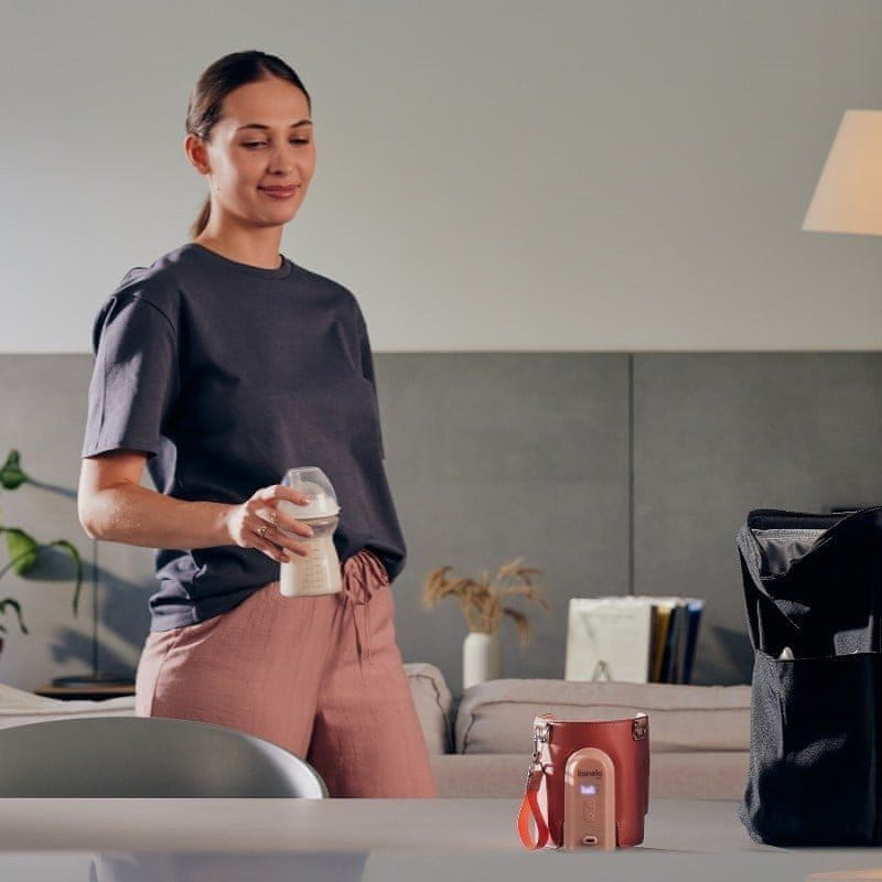 Kompakten in lahek, se zlahka prilega v torbo ali nahrbtnik, 5 nastavitev temperature: 38 °C, 40 °C, 42 °C, 45 °C, 50 °C, vzdrževanje temperature in ponovno segrevanje hladne hrane, segreva steklene in plastične steklenice s premerom ⌀50–80 mm, LCD-zaslon, Priključek USB-C omogoča polnjenje iz električne vtičnice, napajalne banke ali celo v avtomobilu prek vtičnice za prižigalnik, trak za pritrditev na ročaj vozička ali torbo, varnostni gumb za nadzor – grelnik se zažene šele, ko je steklenička vstavljena, omogoča do 9 h delovanja, stanje baterije je prikazano na zaslonu.
