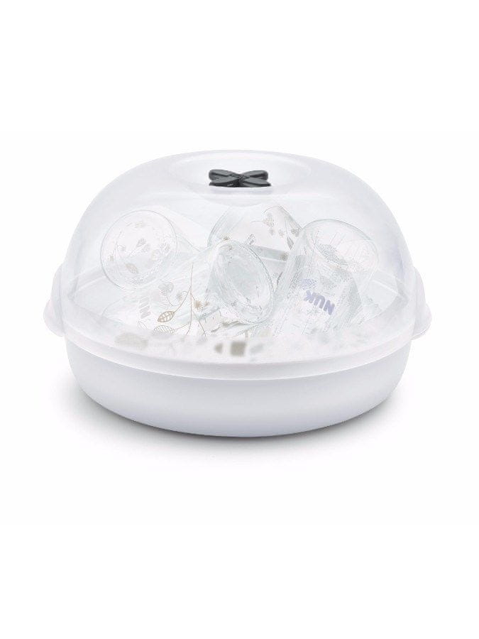 Za dojenčke je potrebna temeljita oskrba, zlasti na področju hranjenja. Da bi olajšali hranjenje dojenčkov večkrat na dan in imeli vsakič čisto in sterilizirano stekleničko, smo izdelali sterilizator za mikrovalovno pečico, ki učinkovito sterilizira vse izdelke NUK v samo 4 minutah. Mikrovalovni parnisterilizator Micro Express Plus sterilizira stekleničke za dojenčke (stekleničke PA niso primerne za to napravo), njihove dodatke (razen dude) in dele prsne črpalke. S paro lahko hkrati sterilizira do štiri 300-mililitrske stekleničke s širokim ustjem, pametno držalo pa ohranja stekleničke v pravem položaju za sušenje. Sterilizirane predmete lahko nato enostavno odstranite s priročnimi kleščami. Mikrovalovni parni sterilizator Micro Express Plus ima le tri sestavne dele, zato je enostaven za uporabo. Prilega se vsaki standardni mikrovalovni pečici z najmanjšim notranjim prostorom, visokim 187 mm ter širokim in globokim 280 mm.Hkrati je združljiv in se lahko uporablja s standardnimi stekleničkami vseh oblik in velikosti, če so izdelane iz materiala, ki je lahko izpostavljen mikrovalovnemu sevanju. Mikrovalovni parni sterilizator je primeren za steklenice vseh oblik in velikosti, ki so narejene iz materialov, varnih za mikrovalovno sevanje. Ima prozoren pokrov in je zdaj opremljen s sistemom za zaklepanje. Po sterilizaciji ga samo obrišite s krpo, če pa ga je treba očistiti, ga lahko operete tudi v pomivalnem stroju. Za higienično odstranjevanje so priložene klešče za steklenice. Glavne značilnosti: zanesljivo razkuževanje v samo 4 minutah posebej zasnovano držalo za stekleničke omogoča namestitev do 4 stekleničk s prostornino 300 ml, vključno z dodatkiidealno za vsakodnevno sterilizacijo otroških stekleničk (razen stekleničk PA) in dodatkov, ki so primerni za mikrovalovne pečicesterilizira do štiri stekleničke in dodatke v samo štirih minutah (nastavitev moči na 1 000 W)enostaven za uporabooznamite najmanjšo potrebno velikost mikrovalovne pečice
