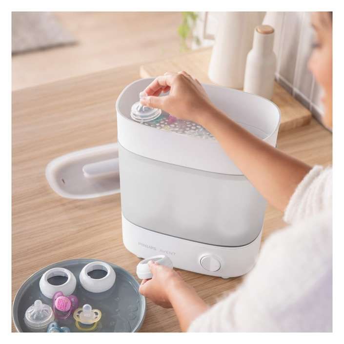 Avent Advanced SCF291/00 parni sterilizator uniči 99,9 % škodljivih mikrobov brez uporabe kemikalij. Vsebino sterilizira v le 10 minutah in se samodejno izklopi. Če ne odpirate pokrova, ostane vsebina sterilna do 24 ur. Ponaša se s prilagodljivo velikostjo (majhna, srednja ali velika), ki se odlično prilega vsem pripomočkom, ki jih želite sterilizirati. Hkrati lahko sterilizirate 6 stekleničk s širokim ali ozkim vratom. Omogoča hitro in enostavno čiščenje.