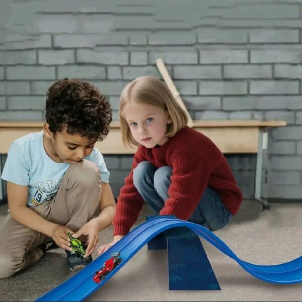 Prilagodljiva in enostavna za namestitevProga se s priloženimi priseski trdno prilepi na večino gladkih površin, tako da lahko otroci oblikujejo edinstvene postavitve in zanke. Ko končate, jo lahko hitro zvijete za enostavno shranjevanje in prenašanje.