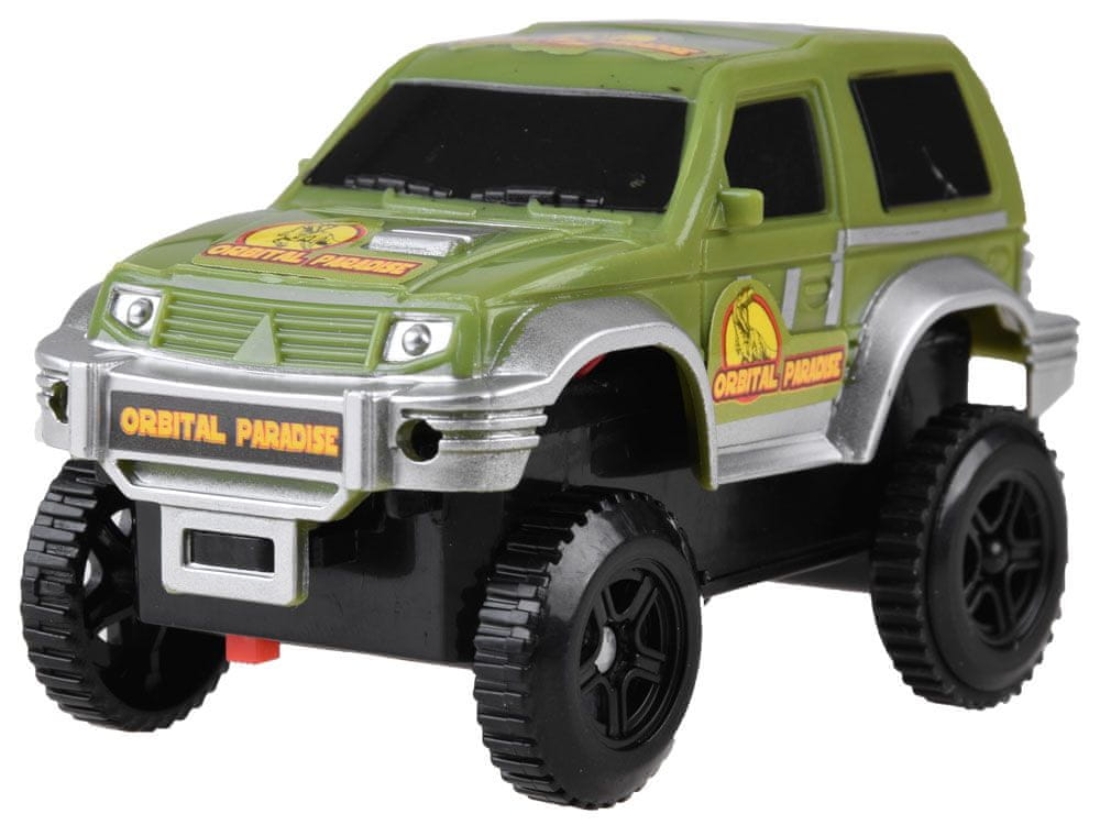Avto priložen v kompletu premaguje pripravljene poti sam (zahteva 1 x AA baterijo, ni priložena). Edinstveno vzdušje parku dinozavrov dajejo figurice prazgodovinskih bitij in palme. Med zabavo si lahko izmislite neverjetne zgodbe, na primer beg pred drvečim balvanom ali razjarjenim dinozavrom.