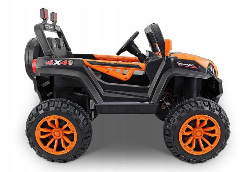 BUGGY ORANGE – ZADETEK! Velik otroški avtomobilček na baterije z daljinskim upravljalnikom. Barva ORANŽNA. Daljinsko upravljanje z daljinskim upravljalnikom Odpiranje vrat (na obeh straneh) Zahvaljujoč daljinskemu upravljalniku lahko vozilo upravljate, ko otrok sedi v notranjosti, ali pa to stori sam, ko sedi za volanom. Vozilo je namenjeno uporabi na prostem, lahko pa se uporablja tudi v večjih prostorih, na terasah ali v dnevnih sobah. Idealno za otroke, stare od 1 do 5 let. Hupa in glasba, ki ju otrok upravlja z volana. Značilnosti: – daljinski upravljalnik, – indikator napolnjenosti baterije, – regulacija glasnosti, – vtičnica za MP3, – baterija/baterije s skupno močjo 12 V, – stikalo za vklop, – polnilnik (vhod 220–230 V), – varnostni pasovi, – svetleče sprednje luči, – neverjetni LED svetlobni učinki, – melodije in hupa na volanu, – vrata, ki se odpirajo navzgor, – zvok zagona motorja; – AMORTIZERJI, – 2 stranski ogledali, – 4 prestave (spredaj: hitro in počasi, zadnja: hitro in počasi), – pedal za plin, – funkcija zibanja (DODATNI MOTOR), – navodila v poljščini in angleščini, – 12-mesečna garancija, – POGON NA 4 KOLESA, – DODATNI SERVOMOTOR Tehnični podatki vozila: – baterija/baterije s skupno močjo 12 V DC 7 Ah, – 4 motorji z močjo 30 W, – dimenzije vozila: 125 × 80 × 74 (D x Š x V v cm), – dve hitrosti vozila: 3–6 km/h, – teža vozila: 19,5/22,5 kg, – povprečni čas vožnje: 1,5–2 uri, – največja obremenitev do 50 KG, Avtomobil za samostojno montažo. Preprosta navodila so priložena kompletu. Največja obremenitev 50 kg. Za vsako vozilo boste prejeli pisno 12-mesečno garancijo in navodila za uporabo v poljščini. Možen prevzem v Przemyślu. Avto ni primeren za otroke, mlajše od 3 let.