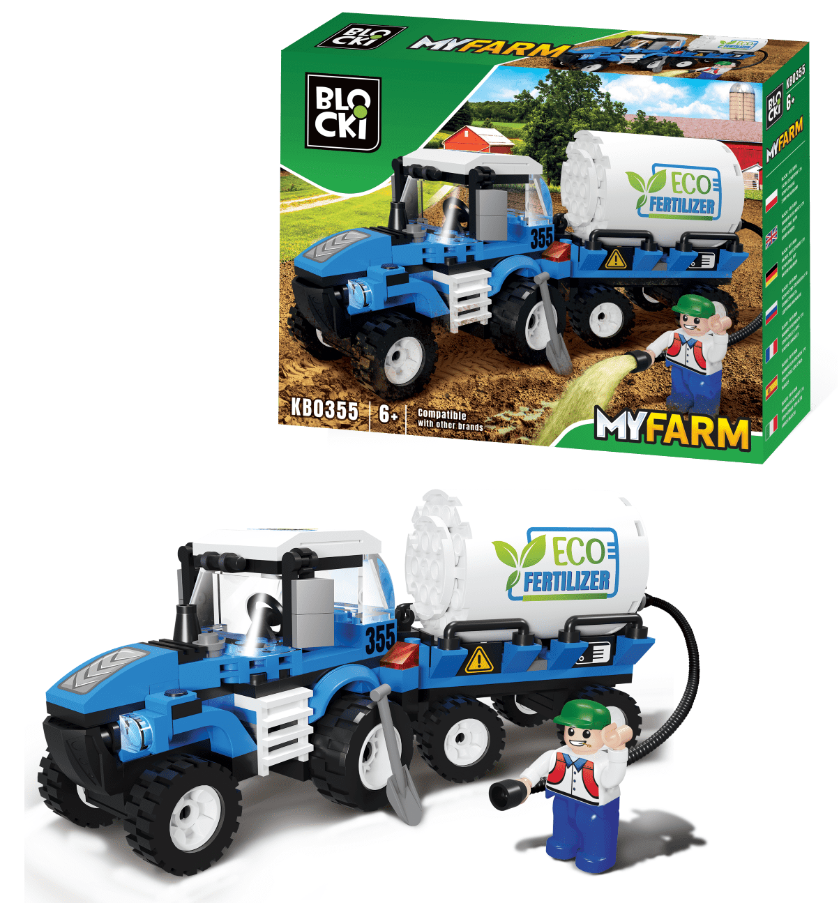 Komplet BLOCKI MyFarm Traktor s cisterno za vodo bo navdušil ljubitelje traktorjev in kmetijske mehanizacije ter bo odlično dopolnil zbirko traktorjev iz prejšnje izdaje BLOCKI MyFarm Osrednji del kompleta je traktor z veliko modro cisterno za vodo Ta komplet je sestavljen iz 170 kosov Komplet vključuje tudi minifiguro voznika in dodatke, potrebne za delo