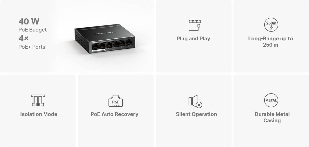 Mrežno stikalo se ponaša s 6 vrati za priključitev. Vrata od 1 do 4 podpirajo PoE+, vsaka od njih pa podpira največjo moč 30 W in so združljiva z napravami, ki se napajajo z 802.3af/at.
