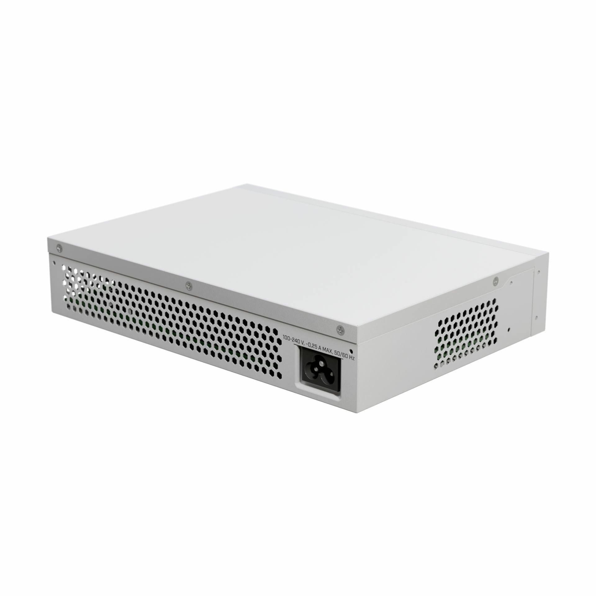 Switch CSS318–16G-2S+IN omogoča enostavno konfiguracijo s preprostim sistemom SwOS podjetja MikroTik, dostopnim neposredno iz spletnega brskalnika. Ta sistem ponuja osnovno funkcionalnost upravljanega switcha, vključno s prenosom med porti, nadzorom razpršenih napadov, filtriranjem MAC naslovov, konfiguracijo VLAN, podvajanjem prometa in omejevanjem pasovne širine. Z nizko porabo energije, ki znaša le 10 W brez dodatkov in do 13 W pri polni obremenitvi, zagotavlja zanesljivost omrežja ob hkratnem varčevanju z energijo.
