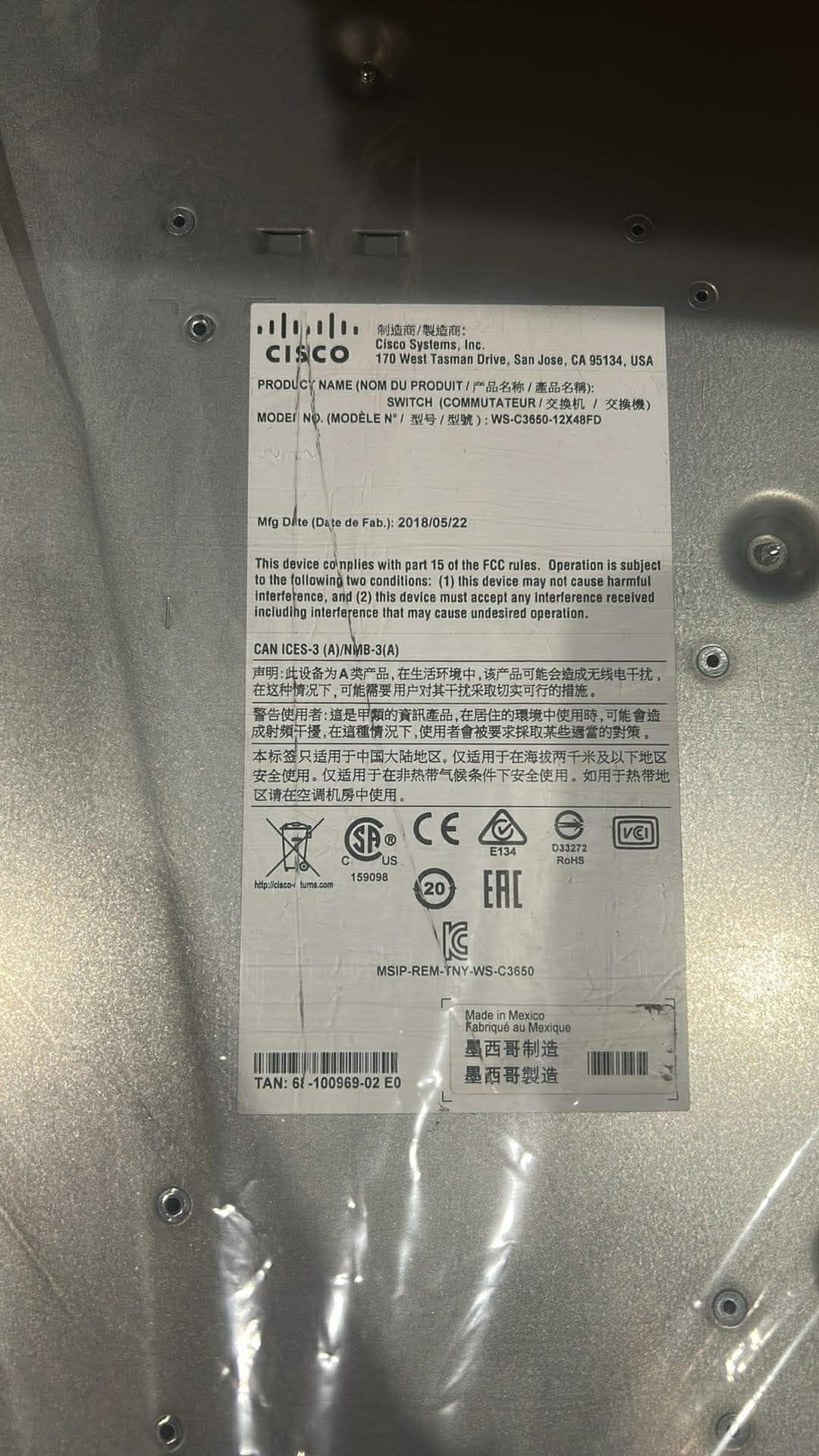 Nikcorp Mrežni preklopnik Catalyst WS-C3650-12X48FD-L, 48x 1G RJ45, 2x 10G SFP+, PoE+ 660W, LAN Base, L2, Stacking, 392 Gbps