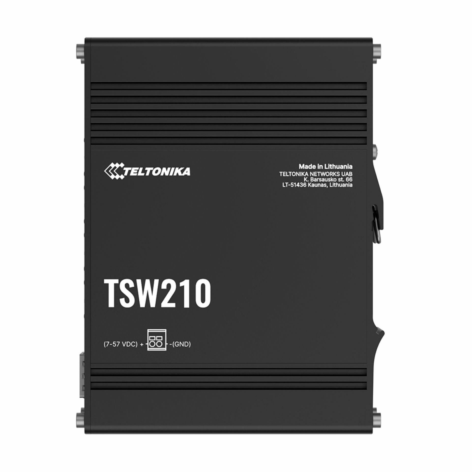 Teltonika TSW210 je mrežno stikalo, ki združuje Gigabit Ethernet in SFP povezljivost. Osem RJ-45 portov omogoča hitro in enostavno povezovanje več naprav, medtem ko SFP porti omogočajo povezavo oddaljenih naprav ob ohranjanju visokih hitrosti in zanesljivosti.