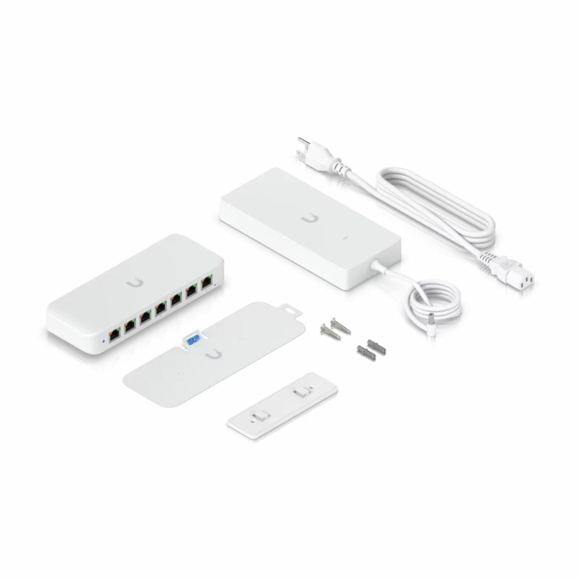 Paket vsebuje: 1× Ubiquiti stikalo Giga 8-port PoE+ Unifi USW-ULTRA-210W, 1× Montažni set, 1× Napajalnik, 1× Napajalni kabel, 1× Navodila